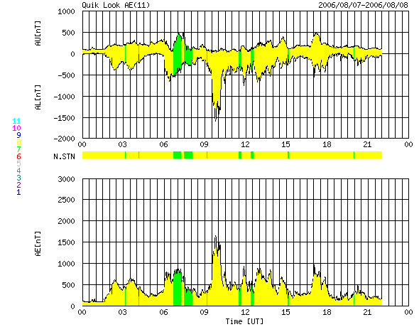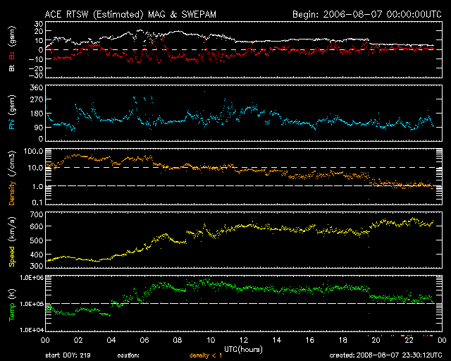 2006/ 8/ 8 08:32 更新 高速太陽風がやってきました(600km/秒)。太陽風磁場が大きく南を向いたため、活発なオーロラ活動が発生しています。 担当 篠原 昨日のニュース以降、太陽風が高速になりました。 速度が上昇する間、太陽風磁場が南寄りになったため、磁気嵐など活発な磁気圏活動が発生しています。 7日9時(世界時7日0時)頃から、太陽風の磁場が10nTを越えるくらいに強まりました。 同時に、セクター境界(太陽風磁場の大まかな方向が切り替わる場所)を越えました。 27日周期の図を見ると、この時刻をはさんで磁場の様子がかなり大きく変化しています。 この様に変化が急に始まっているのは、 セクターを挟んだ変化だったということも関連している様に思われます。 磁場が強まるとともに、速度にも変化が始まりました。 それまで320km/秒とかなり低速だった太陽風は、いったん400km/秒近くまで速度が上がり、 7日13時(世界時7日4時)頃からは本格的な上昇が始まって、 7日21時(世界時7日12時)頃に600km/秒に達しました。 太陽風速度の上昇期間に、太陽風の磁場強度が20nTに達するほどにかなり強まりました。 特に、南北成分が南寄り傾向になり、-10nTくらいの大きな南向きが速度上昇の間ずっと続いていました。 このため、磁気圏に大きなエネルギーが流れ込み、活発な磁気圏活動を起こしています。 オーロラ活動を示すAE指数を見ると、 1日分のグラフ全体にわたって500〜1000nTの活発な活動が続いています。 中でも、7日19時(世界時7日10時)頃には1500nTに達する激しい変化を記録しています。 シベリアでもオーロラ活動に伴う大きな磁場変動が記録されています。 沖縄のデータが途絶えているため、グラフとしてはお見せできませんが、 小規模の磁気嵐も発生しています。 京都大学のDst指数では、-50nTの磁場の減少が記録されています。 この期間はこれまでも高速風が繰り返されていました。 今回の変化を前回と比較すると、最高速度や磁場の乱れなど、 高速風の規模は一段大きくなっています。 しかし、SOHO EIT284では目立ったコロナホールは見られず、 これまでもそういう傾向があったのですが、なかなか予想の難しい領域です。 太陽風の乱れは明日くらいまで続くのではないかと思います。 磁場強度は5nTに下がっていますので、高速風としては最大に達しています。 現在の状態がしばらく続いた後、速度はゆっくりと下がり始めるでしょう。 磁場が既に弱まっている事や、今後は速度が低下に向かうため、 磁気圏活動は次第に小規模なものになります。 太陽は無黒点が続いています。 フレア活動は見られず、穏やかな状態が続くでしょう。 SOHO衛星のEIT284カメラの映像 (c) SOHO (ESA & NASA)