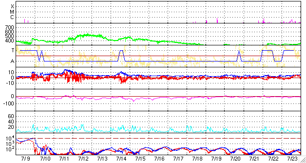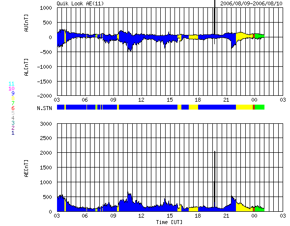 ACEが観測した太陽風の磁場(1番上の枠、白線は全体の強度、赤線は南北成分) および、太陽風の密度(3番目の橙線)、速度(4番目の黄線) (c) NOAA/SEC ![]() リアルタイムAE指数 下段のAEグラフの値が高くなると、オーロラ活動が活発化しています。 (c) 京都大学, NICT ![]() 27日の太陽周期に合わせたデータプロット 太陽が同じ面を地球に向けていた27日前の変化から、今後を予想することができます。 (c) NICT