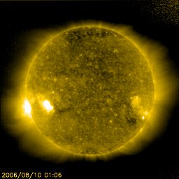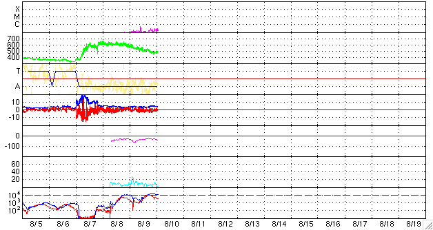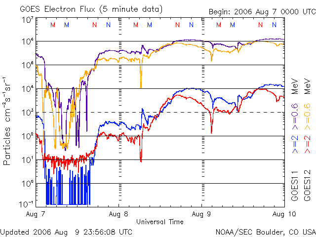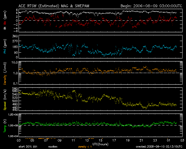 2006/ 8/10 11:15 更新 太陽風の速度は下がり(480km/秒)、高速風領域は終わりつつあります。放射線帯高エネルギー電子が高いレベルにあります。 担当 篠原 地球は高速風領域を抜け出しつつあります。 昨日のニュース以降、太陽風の速度はどんどん下がって行き、 今日の早朝、10日3時(世界時9日18時)頃に500km/秒を切りました。 現在はもう少し下がって、480km/秒とやや高速の状態です。 500km/秒台がもうしばらく続くのではないかと思っていたのですが、 あっさりと速度が下がってしまいました。 速度の最高値は高かったのですが、高速風領域の規模は小さめだったようです。 この後もゆっくりと速度は下がり続け、明日には地球は高速風を抜け出すのではないでしょうか。 太陽風磁場は強度が4nTで、普通の強さです。 南北成分は細かく振動していますが、-2nT程に小さく南を向いた状態が長く見られます。 速度が下がってきて、南向きの振幅も弱かったので、小規模の磁気圏活動が発生しています。 ただし、南寄りの傾向が続いていたので、一日を通して活動が見られました。 太陽風の速度は更に下がっていますので、磁気圏活動は次第に穏やかになって行くでしょう。 27日周期の図を見てください。 上段の27日前の図を見ると、今後の宇宙天気を大まかに予想することができます。 今日の上段の図では、7月15日以降、太陽風はずっと低速のままです。 これを下の図に当てはめると、図の最後の8月19日まで穏やかな状態が続くと予想されます。 こちらの長期版によると、次の高速風の到来は8月23日頃となりそうです。 放射線帯の高エネルギー電子は、更に密度を増しています。 GOES11に続き、GOES12も警戒ライン(10の4乗の線)に達しています。 増加の速度は鈍っていて、これ以上大きく密度が上がることはないでしょう。 しかし、減衰はゆっくりです。 これから数日にわたって警戒状態が続くと予想されます。 太陽では、903黒点群が発生しています。 しかし、フレア活動としては、 SOHO EIT284で東の端(左の端)から上がりつつある、新しい活動領域が注目されます。 GOESのX線動画では、ここで小さな活動がひんぱんに起こっていて、 こちら側に回って来た後に、小規模の活動を起こすようになるかもしれません。 やがて黒点群が姿を現すでしょう。 SOHO衛星のEIT284カメラの映像 (c) SOHO (ESA & NASA)