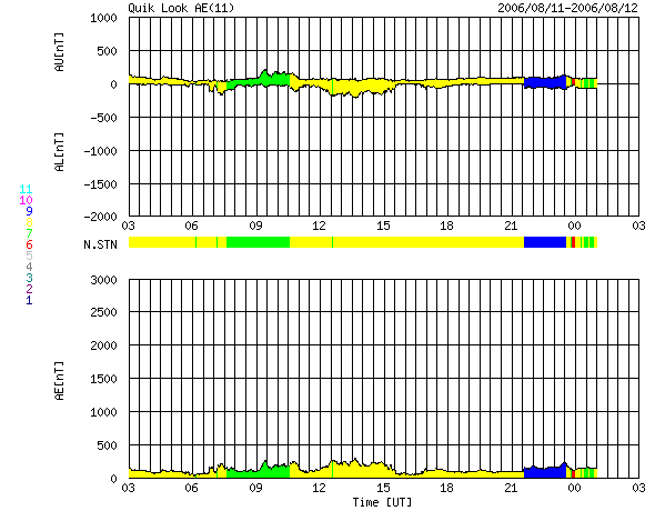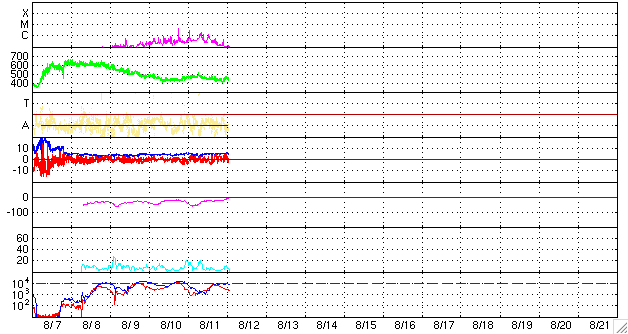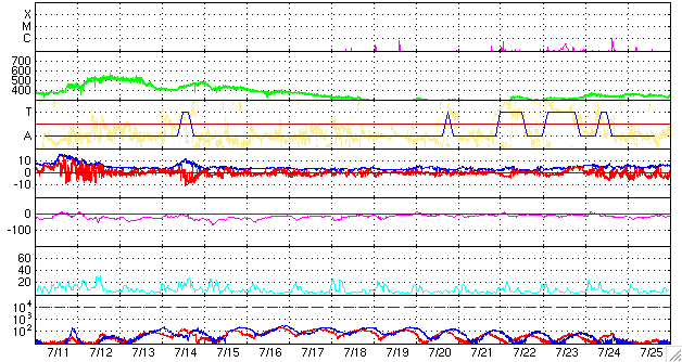 SOHO衛星のMDIカメラによる太陽黒点 (c) SOHO (ESA & NASA) ![]() GOES衛星の太陽X線データ (c) NOAA/SEC ![]() ACEが観測した太陽風の磁場(1番上の枠、白線は全体の強度、赤線は南北成分) および、太陽風の密度(3番目の橙線)、速度(4番目の黄線) (c) NOAA/SEC ![]() リアルタイムAE指数 下段のAEグラフの値が高くなると、オーロラ活動が活発化しています。 (c) 京都大学, NICT ![]() 27日の太陽周期に合わせたデータプロット 太陽が同じ面を地球に向けていた27日前の変化から、今後を予想することができます。 (c) NICT
