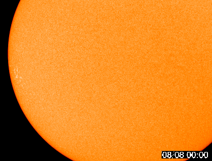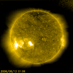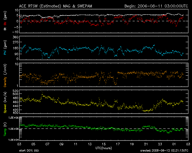 2006/ 8/12 11:23 更新 904黒点群が大きな姿を見せています。太陽風はやや高速ですが(450km/秒)、磁気圏は穏やかです。 担当 篠原 904黒点群が大きな姿を見せています。 昨日のニュース以降も、小さなC1の小規模フレアを2回起こしています。 GOESのX線動画を見ていると、小さな活動が続いていて、引き続き活動的な状態にある様です。 今後、Mクラスの中規模フレアを起こす可能性もあるとのことで、注目する必要があります。 太陽風は、ほとんど速度の変化が無く、450km/秒前後でやや高速の状態が続いています。 磁場強度は5nTでほぼ一定。 南北成分はゆっくりと南北に変動しています。 変動はしていますが振幅としては小さいことや、速度もだいぶ下がっているため、 磁気圏活動は概ね静穏です。 AE指数には目立った変化は観測されていません。 今日あたりから太陽風は更に速度を下げ、低速状態へと変わって行くでしょう。 放射線帯の高エネルギー電子は警戒ラインぎりぎりですが、まだ高いレベルを保っています。 昨日の磁気圏の乱れの影響が注目されましたが、影響は小規模で、やや早めに減少したという程度でした。 それでも、明日くらいには警戒ラインを完全に下回りそうです。 太陽の東端から、大型の黒点群(904群)が現れました(SOHO MDIカメラ)。 (c) ESA & NASA ![]() SOHO衛星のEIT284カメラの映像 (c) SOHO (ESA & NASA)