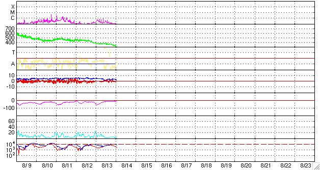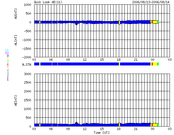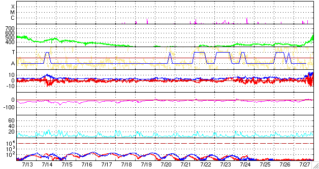 ACEが観測した太陽風の磁場(1番上の枠、白線は全体の強度、赤線は南北成分) および、太陽風の密度(3番目の橙線)、速度(4番目の黄線) (c) NOAA/SEC ![]() GOES衛星の太陽X線データ (c) NOAA/SEC ![]() ACEが観測した太陽風の磁場(1番上の枠、白線は全体の強度、赤線は南北成分) および、太陽風の密度(3番目の橙線)、速度(4番目の黄線) (c) NOAA/SEC ![]() リアルタイムAE指数 下段のAEグラフの値が高くなると、オーロラ活動が活発化しています。 (c) 京都大学, NICT ![]() 27日の太陽周期に合わせたデータプロット 太陽が同じ面を地球に向けていた27日前の変化から、今後を予想することができます。 (c) NICT