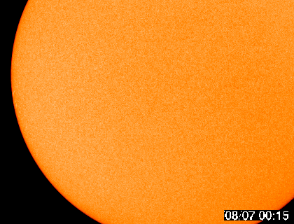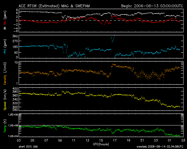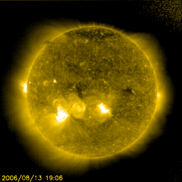 2006/ 8/14 11:36 更新 904黒点群は活動度が下がっている様です。太陽風はかなり低速になっています(300km/秒)。 担当 篠原 904黒点群は相変わらず大きな姿を見せています。 しかし、その活動度は落ちてきているようです。 GOES衛星のX線グラフでは、Bクラスのとても小さな活動が見られますが、 Cクラスに及ぶほどのものではなくなっています。 動画で見ていても、小さな瞬きは見られますが、見え始めた頃の元気はなくなっています。 可視光で見える黒点の形も単純になって来ていますし、 磁場構造の複雑さも下がっているようで、蓄えているエネルギーは減少しているのではないでしょうか。 NOAA/SECのフレアの発生確率もだいぶ下がって来ました。 今後は、小規模フレアに対する注意を考えれば良さそうです 太陽風は、昨日より350km/秒が続き、今朝になって一気に300km/秒に下がりました。 かなり低速になっています。 磁場強度も2〜4nTと弱まっています。 磁場の南北成分は0nT付近に留まっていて、速度が遅いこともあり、磁気圏はとても静穏です。 AE指数には、まったくと言ってよいほど変化が見られません。 掲載している27日周期の図を見ると、前周期(上段)の右端にやっと次の高速風の姿が見えて来ました。 今周期も高速風がこのタイミングで来るかどうかは、 今後現れるコロナホールの様子を見る必要がありますが、 このままだとすると、22日までは太陽風、磁気圏ともに穏やかな状態が続くでしょう。 放射線帯の高エネルギー電子は、ほとんど下がらずにやや高いレベルを維持しています。 片方のGOES11衛星だけが、警戒ラインにぎりぎりで達しています。 磁気圏が乱れる見込みがないことから、この後もゆっくりと下がって行くでしょう。 SOHO MDIカメラによる、巨大な太陽黒点群(904群)の登場。 (c) ESA & NASA ![]() SOHO衛星のEIT284カメラの映像 (c) SOHO (ESA & NASA)