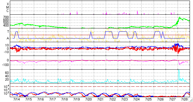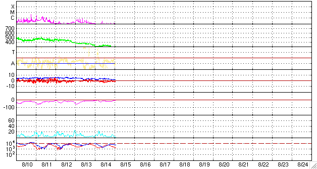 SOHO衛星のMDIカメラによる太陽黒点 (c) SOHO (ESA & NASA) ![]() GOES衛星の太陽X線データ (c) NOAA/SEC ![]() ACEが観測した太陽風の磁場(1番上の枠、白線は全体の強度、赤線は南北成分) および、太陽風の密度(3番目の橙線)、速度(4番目の黄線) (c) NOAA/SEC ![]() リアルタイムAE指数 下段のAEグラフの値が高くなると、オーロラ活動が活発化しています。 (c) 京都大学, NICT ![]() 27日の太陽周期に合わせたデータプロット 太陽が同じ面を地球に向けていた27日前の変化から、今後を予想することができます。 (c) NICT