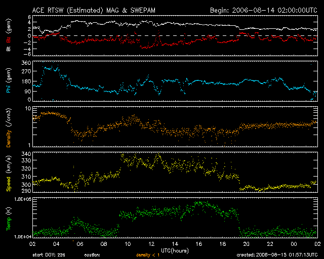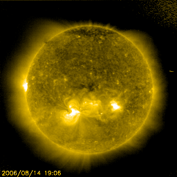 2006/ 8/15 11:00 更新 太陽風は低速で(300km/秒)、磁気圏も静穏です。904黒点群も目立った活動は起こしていません。 担当 篠原 904黒点群が太陽の中心に近づいています。 規模はほとんど変化がありません。 X線のグラフでは目立ったフレア活動はなく、かなり穏やかになっている様です。 黒点は太陽の磁場が外側へ飛び出したもので、普通の磁石と同じくN極とS極の構造を持ちます。 可視光で見るとどちらも黒い点なのですが、 磁場で見ると逆の極性(磁力線で考えると出口と入口)になっているのです。 その分布を特殊なカメラで観測したものがあります。 今日の図の1枚目は、SOHO衛星が撮影した904黒点群の磁場構造の様子です。 白がN極、黒がS極にあたるそうですが、黒点が出現してすぐのやや活発だった頃から、 おとなしくなって来た現在までの変化を見ることができます(いつもの可視光写真と比較してください)。 簡単に考えると、白と黒が入り交じっているとフレア活動がより活発になり、 白と黒が単純に分離するようになると活動度は下がって来るそうです。 この写真は、SOHOのページで見ることができます(Magnetogramとあります)。 見慣れた可視光の太陽とは違った太陽の顔も眺めてみてください。 太陽風は、300km/秒付近のとても遅い状態が続いています。 ACEの図を見ると、真ん中のところで、速度が上昇し磁場が安定して南を向くという変化が見られます。 普段だと、磁気圏活動が活発化するパターンの変化なのですが、 変化の幅がとても小さく、速度は330km/秒に上がった程度、南向きの磁場も-2nTくらいでしかありません。 このため、磁気圏活動で目立った変化は見られず、AE指数はとても穏やかです。 この低速太陽風は22日頃まで続くと予想されます。 放射線帯の高エネルギー電子はゆっくりと低下に向かっています。 今日の図では、最高値が警戒ラインの10の4乗から一段下がった所で止まっています。 注意すべき状態は一段落ついたと考えられます。 SOHO MDIカメラによる、904黒点群(904群)の磁場構造の8月7日から8月14日までの時間変化。 (c) ESA & NASA ![]() SOHO衛星のEIT284カメラの映像 (c) SOHO (ESA & NASA)
