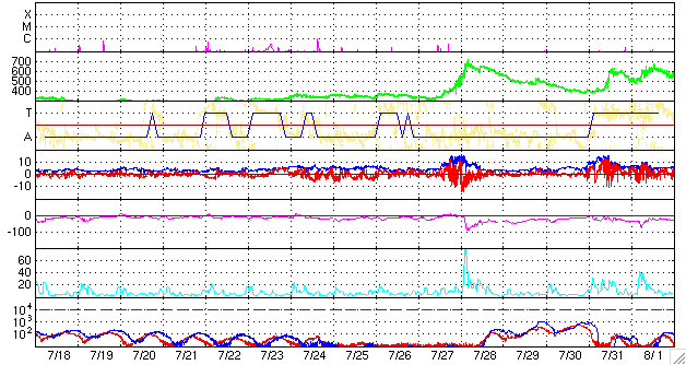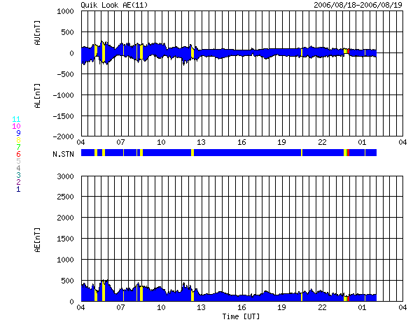 ACEが観測した太陽風の磁場(1番上の枠、白線は全体の強度、赤線は南北成分) および、太陽風の密度(3番目の橙線)、速度(4番目の黄線) (c) NOAA/SEC ![]() リアルタイムAE指数 下段のAEグラフの値が高くなると、オーロラ活動が活発化しています。 (c) 京都大学, NICT ![]() 27日の太陽周期に合わせたデータプロット 太陽が同じ面を地球に向けていた27日前の変化から、今後を予想することができます。 (c) NICT