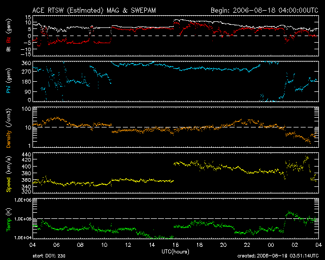 2006/ 8/19 12:54 更新 904黒点群は穏やかになっています。これから明日にかけて、CMEによる太陽風の乱れが到来するでしょう。 担当 篠原 19日1時(世界時18日16時)にACE衛星で、 太陽風の速度が360km/秒から410km/秒に急に上がっています。 太陽風の磁場も12nTに急に強まっていて、小規模の太陽風の乱れがやってきた様です。 速度としては通常のレベルに戻ったという程度の上昇ですし、 強まった後の磁場は北寄りになっていて、磁気圏への影響はほとんどありませんでした。 オーロラ活動を示すAE指数のグラフは、後半はほとんど乱れていません。 むしろ、前半の方が300nTくらいの小規模の活動が続いています。 これは、この時間帯に太陽風の磁場が安定して南を向いていたためです。 ACEの図では、-5nTくらいの南向きが続いているのが分かります。 この時間帯は速度が350km/秒と遅かったので、磁気圏の乱れは小規模に留まりました。 太陽風の乱れは小さなもので、磁場強度は既に下がっていますし、 速度も低速へ戻っていくでしょう。 16日23時半(世界時16日14時半)のC3.6の小規模フレアに続いて起こった CME(太陽ガスの放出現象)による太陽風の乱れが、 これから明日にかけて地球にやってくると思われます。 太陽風の速度が一気に上がり、 オーロラ活動や磁気嵐などの磁気圏活動が活発になる可能性があります。 乱れの到来が早いほど、速度などの乱れは大きなものになります。 乱れの到来が遅くなる時は、速度が遅い事を示していますので、乱れも小さくなるでしょう。 上昇後の速度の大きさ、南向き磁場の大きさに注目して下さい。 太陽の904黒点群は、活動度がすっかり下がっています。 黒点としても、左側に見えているグループがどんどん小さくなっているようです。 もう、活発な活動を起こす事はなさそうに思います。 SOHO衛星のEIT284カメラの映像 (c) SOHO (ESA & NASA)