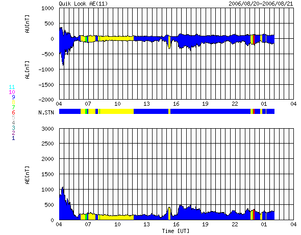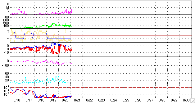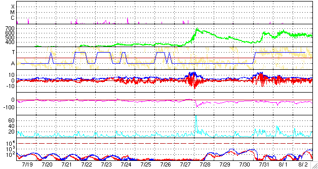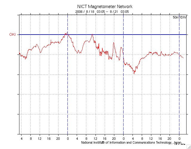 ACEが観測した太陽風の磁場(1番上の枠、白線は全体の強度、赤線は南北成分) および、太陽風の密度(3番目の橙線)、速度(4番目の黄線) (c) NOAA/SEC ![]() リアルタイムAE指数 下段のAEグラフの値が高くなると、オーロラ活動が活発化しています。 (c) 京都大学, NICT ![]() 沖縄の磁場擾乱 下へ下がるほど、擾乱が発達している事を意味します。 (c) NICT ![]() GOES衛星の太陽X線データ (c) NOAA/SEC ![]() 27日の太陽周期に合わせたデータプロット 太陽が同じ面を地球に向けていた27日前の変化から、今後を予想することができます。 (c) NICT
