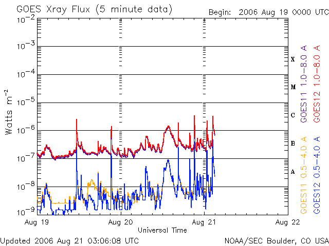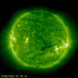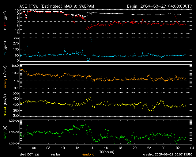 2006/ 8/21 12:08 更新 磁気圏の活動は静穏な状態に戻ってきました 担当 北村 太陽風の速度は徐々に減速しだして、現在は400kkm/s程度まで下がっています。 太陽風磁場の南北成分(赤い線)は、世界時で20日の3時頃に北向になりましたが、 13時以降に再び弱い南向きになり、現在まで継続しています。 この太陽風の変化によって、一時的にオーロラ活動が活発になりましたが、 AE指数を見ると、現在は、200-300nT程度の静穏な状態に戻っています。 SOHO EIT195(緑)を見ますと、西(向かって右側)の明るい部分が そろそろ端の方へ消えようとしています。GOESのX線のグラフを見ると この明るい部分(活動領域904)は昨日から今日にかけてCクラスのフレアを 5回ほど起こしています。完全に隠れるまで、もうしばらく注意が必要でしょう。 今後の変化ですが、前周期と比較すると23日頃からコロナホールの影響が 現れてきそうですが、SOHOの画像を見る限りでは前周期であった北側の コロナホールがはっきりとせずに、変わりに赤道付近にコロナホールが見えます。 」前々周期からコロナホールの変化が早く、27日周期の構造がずれ始めているので 少し注意が必要です。 SOHO衛星のEIT195カメラの映像 (c) SOHO (ESA & NASA)