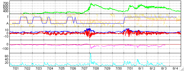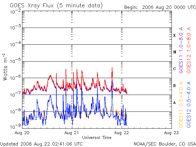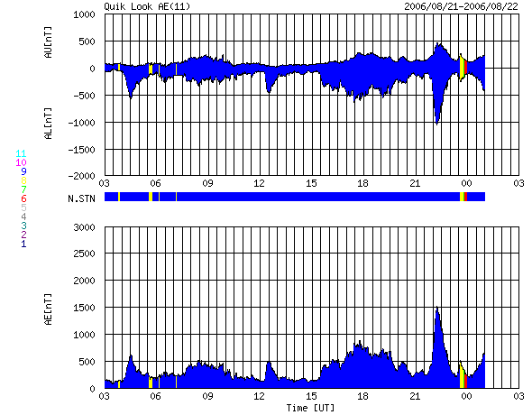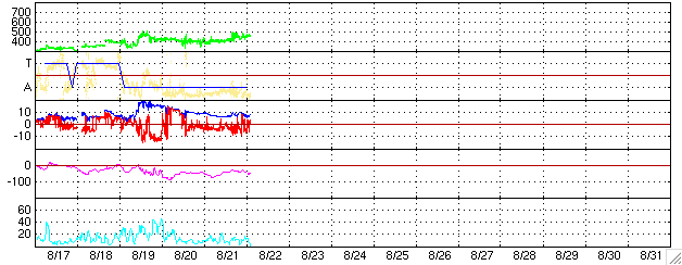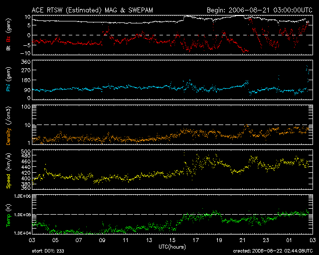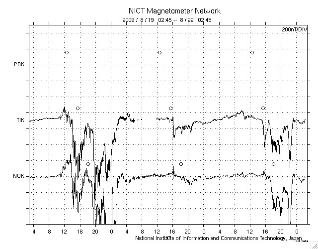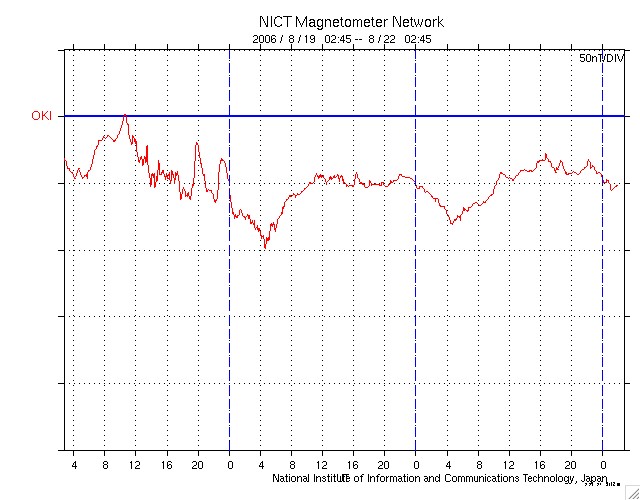 2006/ 8/22 11:45 更新 太陽風速度がやや上昇しました。(500km/秒) 担当 北村 いったん減速しかけた太陽風速度ですが、再び上昇傾向に転じて、現在500km/秒程度 に達しています。速度は上昇していますが、太陽風磁場の南向き成分(赤い線)は -5nT程度で推移しているため、沖縄磁場変動は静穏に戻りつつあるようです。 しかし、19時から21時にかけては一時的に太陽風磁場の南向き成分は-10nT程度まで 強くなりその後急に北向に転じています。このような太陽風の変化はオーロラ活動が 活発になるときの典型的な変動で、このときのAE指数のグラフを見ると21時以降に 1500nTに達する非常に強いオーロラの活動が見られます。 太陽の活動は、GOESのX線のグラフを見ると、21日20時頃のCクラスフレア以降 大きなフレアは発生しておらず、全体のレベルも少し下がってきている様に見えます。 今日はSOHOの画像が見られませんが、おそらく活動領域904が西の端へ隠れつつ あるのではないでしょうか? 今後、フレアの発生は収まっていくと思われますが、 太陽風の速度がどこまで上がり続けるのか注意が必要です。 ACEが観測した太陽風の磁場(1番上の枠、白線は全体の強度、赤線は南北成分) および、太陽風の密度(3番目の橙線)、速度(4番目の黄線) (c) NOAA/SEC ![]() 沖縄の磁場擾乱 下へ下がるほど、擾乱が発達している事を意味します。 (c) NICT ![]() リアルタイムAE指数 下段のAEグラフの値が高くなると、オーロラ活動が活発化しています。 (c) 京都大学, NICT ![]() シベリアで観測された3日間の磁場データ 右側の3分の1が、昨日のデータになります。グラフが上がったり下がったりすると、オーロラ活動が活発化しています。 (c) NICT ![]() GOES衛星の太陽X線データ (c) NOAA/SEC ![]() 27日の太陽周期に合わせたデータプロット (太陽風版) 太陽が同じ面を地球に向けていた27日前の変化から、今後を予想することができます。 (c) NICT