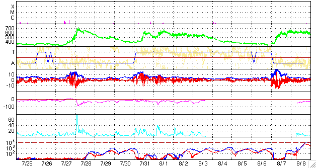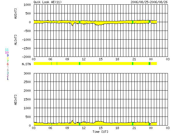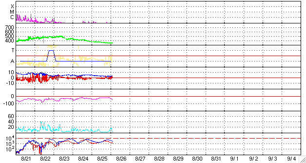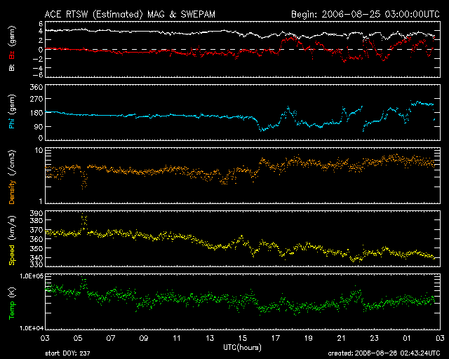 2006/ 8/26 11:45 更新 太陽風は低速で、磁気圏も穏やかです。明日より、高速風がやって来るでしょう。 担当 篠原 SOHO EIT284の観測がお休みですので、GOESのX線画像を強調してコロナホールの位置を見ています。 今日の写真では、太陽の中心からやや西に過ぎた場所に暗い穴が見えています。 ここがコロナホールです。 もう1日ほど経つと、太陽の西半分の真ん中に達するでしょう。 そこが、高速風が地球へ到達するタイミングを計る目安の位置です。 現在の太陽風は、速度が350km/秒を切り、かなり低速になっています。 磁場強度は4nT。 南北成分は0nTをはさんで小さな変化をしている程度です。 磁気圏への影響は小さく、AE指数にはごく小さな変化が見えている程度です。 穏やかな状態が続いています。 最初に述べたように、明日くらいからコロナホールによる高速風が始まると予想されます。 これまでのパターンを振り返ると、初めに磁場強度が強まりと、セクターの切り替わりが発生します。 やがて、数時間ほど遅れて速度の上昇が始まるという変化が見られています。 前回は、最高速度が600km/秒、高速風は4日ほど続きました。 今回はどうなるでしょうか。 太陽のフレア活動は穏やかです。 905黒点群の規模に変化はありません。 活動度も低く、目立ったフレアは起こしそうにありません。 GOES衛星のX線カメラで撮影した太陽の様子。26日11時 (世界時26日2時)。 (c) NOAA/SEC ![]() ACEが観測した太陽風の磁場(1番上の枠、白線は全体の強度、赤線は南北成分) および、太陽風の密度(3番目の橙線)、速度(4番目の黄線) (c) NOAA/SEC ![]() リアルタイムAE指数 下段のAEグラフの値が高くなると、オーロラ活動が活発化しています。 (c) 京都大学, NICT ![]() 27日の太陽周期に合わせたデータプロット 太陽が同じ面を地球に向けていた27日前の変化から、今後を予想することができます。 (c) NICT