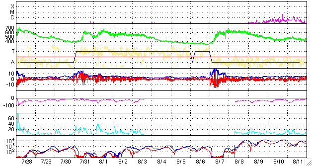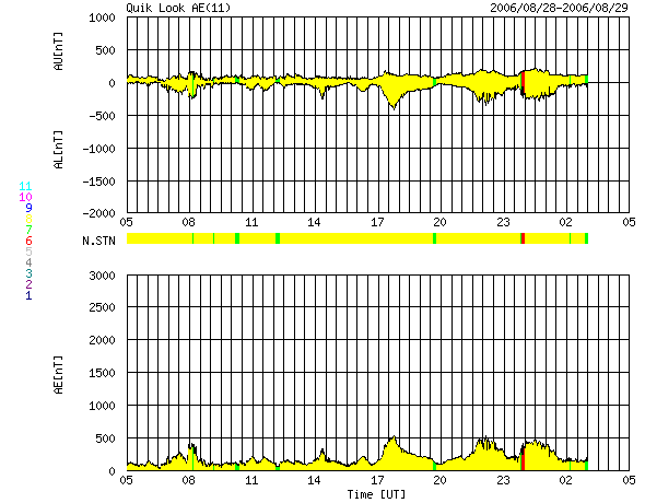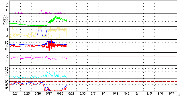 ACEが観測した太陽風の磁場(1番上の枠、白線は全体の強度、赤線は南北成分) および、太陽風の密度(3番目の橙線)、速度(4番目の黄線) (c) NOAA/SEC ![]() リアルタイムAE指数 下段のAEグラフの値が高くなると、オーロラ活動が活発化しています。 (c) 京都大学, NICT ![]() 27日の太陽周期に合わせたデータプロット 太陽が同じ面を地球に向けていた27日前の変化から、今後を予想することができます。 (c) NICT