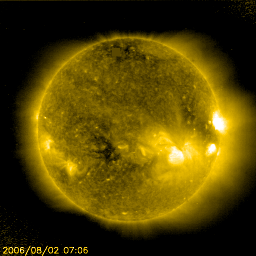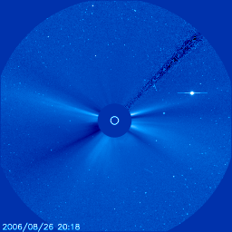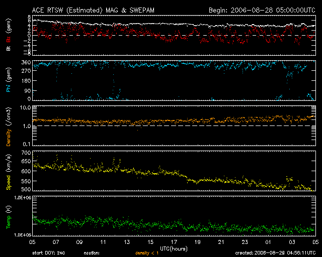 2006/ 8/29 13:57 更新 高速太陽風が続いています(500km/秒)。これから、CMEによる太陽風の乱れが加わりそうです。 担当 篠原 午前中に野外活動が入りました。更新が遅くなり申し訳ありません。 27日の夜から、コロナホールによる高速太陽風が始まりました。 速度は、昨日の28日13時(世界時28日4時)頃に、650km/秒まで達しました。 ここが最高速だった様で、その後はゆっくりと低下傾向に入り、現在は500km/秒まで下がっています。 しかし、27日前の変化と比較すると、明日いっぱいくらいは現在程度の高速状態が続きそうに思います。 最高速に達すると同時に、磁場強度は10nTと強まっていた状態から、5nTの普通の状態に弱まりました。 南北成分は細かく南北に振動を始め、 その影響で500nTくらいの中規模のオーロラ活動が何度も発生しています。 さて、27日5時(世界時26日20時)のC2.5の小規模フレアに伴って発生した、 CME(太陽ガスの放出現象)の影響がそろそろ地球にやってくると思います。 CMEの様子は、SOHO LASCO C3の動画を見てください。 発生箇所の605黒点群が南寄りに位置していたため、飛び出したガスも南側が濃くなっています。 北向きのガスの飛び出しはかすかですので、地球方向にはそれほど飛んで来ていないかもしれません。 フレア自体も小規模だったので、それほど大きな乱れは到来しないのではないでしょうか。 乱れは、今日の夕方から、明日にかけてやって来ると思われます。 (現在見られている高速風に乗ってくるので、案外早めに来るかもしれません) 速度が再び上昇し、磁場の変化に応じて、磁気圏活動が活発化するでしょう。 特に、太陽風の乱れが強い南向きの磁場を運んで来た場合は、磁気圏も大きく乱れます。 今後の太陽風の変化に注意が必要です。 さて、もうひとつ先の変化を予想しましょう。 27日周期の図を見ると、前回、8月7日から次の高速風が来ています。 その発生源と思われるコロナホールを、8月2日のSOHO EIT284で見ることができます。 太陽の南側にやや小さく見えています。 これと同じコロナホールが、GOESのX線写真にもかすかですが見ることができます。 この時は、コロナホールの位置と比較して、高速風の始まりが遅く、 いつものようにはコロナホールから高速風の始まりは予想できませんでした。 27日周期の図から予想すると、9月3日になります。 太陽では、905黒点群がなかなか元気が良く、小さな活動を頻繁に続けています。 昨日はC1の小さな小規模フレアを一度起こしました。 この後も、小・中規模のフレア活動を起こす可能性があります。 放射線帯の高エネルギー電子が増加しつつあります。 まだ、警戒ラインよりもずっと下ですが、今後の増加が予想されますので、注目してください。 GOES衛星のX線カメラで撮影した太陽の様子。29日13時 (世界時29日4時)。 (c) NOAA/SEC ![]() SOHO LASCO C3カメラによる、27日5時(世界時26日20時)のC2.5小規模フレアに続いて発生したCME。 (c) ESA & NASA ![]() SOHO衛星のEIT284カメラの映像 (c) SOHO (ESA & NASA)