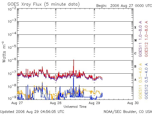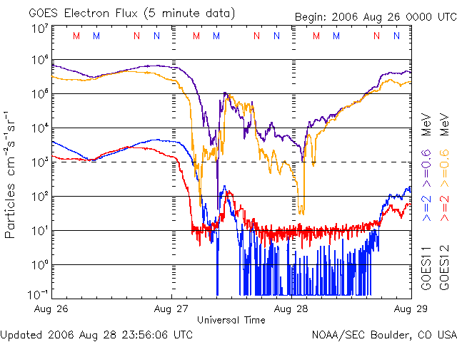(c) SOHO (ESA & NASA) ![]() GOES衛星の太陽X線データ (c) NOAA/SEC ![]() GOES衛星による、静止衛星軌道における高エネルギー電子の変化 (c) NOAA/SEC ![]() | ||||||||||||||||||||||||||||||||||||||||||||||||||||||||||||