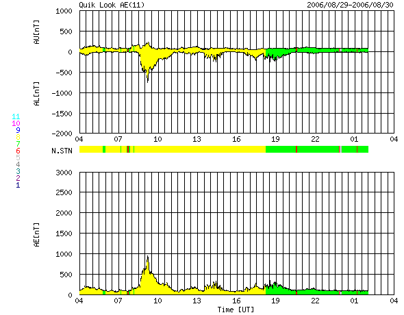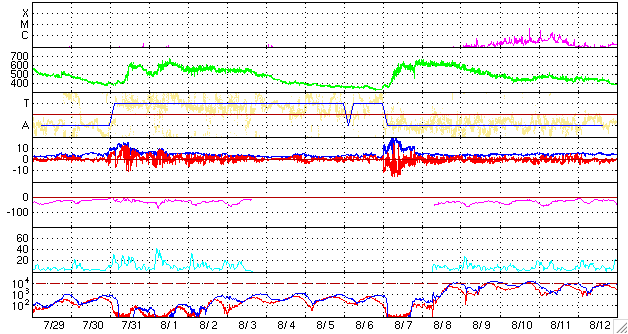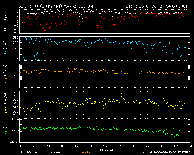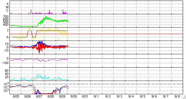 2006/ 8/30 12:29 更新 高速の太陽風が続いています(550km/秒)。CMEの乱れはやってきませんでした。 担当 篠原 昨夜から今日にかけて到来が予想されていたCME(太陽ガスの放出現象)の乱れは、 地球へは来なかった様です。 太陽風は550km/秒と安定した高速の状態が続いています。 磁場強度は約4nTで、南北の振動が見られています。 今日のACEの図を見て分かるように、太陽風はほとんど一定した状態が続いていますので、 CMEの擾乱は現時点ではやってこなかったと見られます。 発生から既に3日経っており、これ以上遅れるとも考えにくいので、 地球方向へはほとんど来なかったと考えてよいのではないでしょうか。 AE指数を見ると、1000nTの活発なオーロラ活動が一度発生しています。 ACEの図で磁場の南向き(赤線のマイナス成分)が強まったところに対応しています。 その他は、とても小さな変動が見られている程度です。 太陽風は今日いっぱいは高速状態が続き、明日くらいから下がり始めると予想されます。 (27日周期の図を参照) ACEの最後の部分では、南北成分は北寄りになっていて(赤線がプラス方向)、 この状態が続けはオーロラ活動は穏やになります。 再び南向きが現れると、小・中規模の活動が発生するようになるでしょう。 GOESシリーズの新しい13号衛星から、X線の画像が届くようになっています。 今日は、その画像を掲載します。 これまでのGOES12のX線画像と比較すると圧倒的に鮮明です。 南側にコロナホールが広がっているのが、くっきりと見えています。 (昨日の掲載写真と比較してみてください) コロナホールは既に中心線を過ぎ、明後日くらいには地球への影響域に達しそうです。 しかし、前回は高速風の到来はもっと遅く、今日の状態から4日後くらいにやってきました。 今日の写真で濃く見えているコロナホールは、太陽の南に寄りすぎていて、 地球へはあまり影響を及ぼさないのかもしれません。 むしろ、今、太陽の中心付近にある、淡いコロナホールの高速風が地球へやってくるのでしょうか。 週末から来週にかけての太陽風の変化に注目してください。 放射線帯の高エネルギー電子は増加を続けています。 明日あたりに警戒ラインに達するかもしれません。 引き続き注目する必要があります。 太陽では905黒点群が、黒点群としての規模は縮小傾向にありますが、 昨日は小さな活動を活発に起こしていました。 C1.5, C2.1とCクラスに達する変化も発生しています。 しかし、この後は次第に穏やかになっていくと思われます。 GOES13衛星のX線カメラで撮影した太陽の様子。30日12時 (世界時30日3時)。 (c) NOAA/SEC ![]() ACEが観測した太陽風の磁場(1番上の枠、白線は全体の強度、赤線は南北成分) および、太陽風の密度(3番目の橙線)、速度(4番目の黄線) (c) NOAA/SEC ![]() リアルタイムAE指数 下段のAEグラフの値が高くなると、オーロラ活動が活発化しています。 (c) 京都大学, NICT ![]() 27日の太陽周期に合わせたデータプロット 太陽が同じ面を地球に向けていた27日前の変化から、今後を予想することができます。 (c) NICT