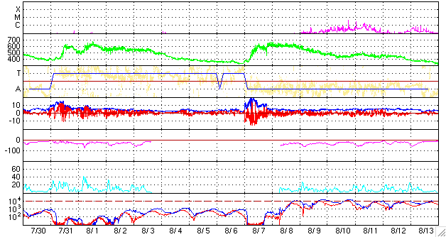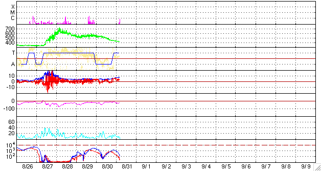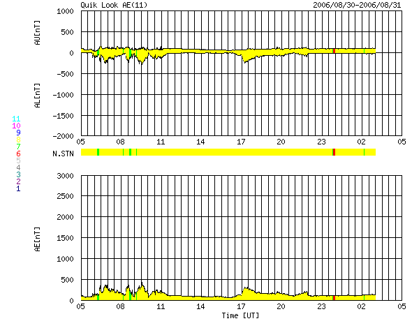 ACEが観測した太陽風の磁場(1番上の枠、白線は全体の強度、赤線は南北成分) および、太陽風の密度(3番目の橙線)、速度(4番目の黄線) (c) NOAA/SEC ![]() リアルタイムAE指数 下段のAEグラフの値が高くなると、オーロラ活動が活発化しています。 (c) 京都大学, NICT ![]() 27日の太陽周期に合わせたデータプロット 太陽が同じ面を地球に向けていた27日前の変化から、今後を予想することができます。 (c) NICT