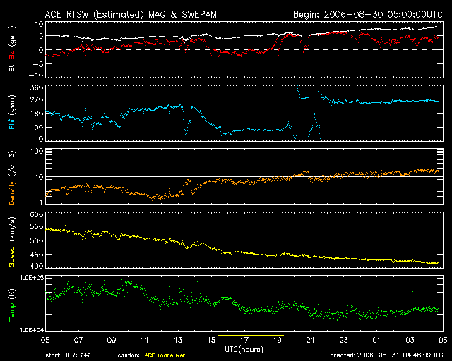 2006/ 8/31 13:47 更新 太陽風は速度が下がり、通常の速度に戻っています。磁気圏では、小規模のオーロラ活動が見られていました。 担当 篠原 太陽風の速度はどんどん下がり、昨日の550km/秒から、既に420km/秒と通常の速度に戻っています。 27日周期の図で比較すると、前周期よりも高速風の領域が少し小さくなった様です。 磁場強度は5nTからゆっくりと増加して、8nTにやや強まっています。 南向きはあまり見られていませんが、小規模のオーロラ活動がいくらか見られていた様です。 AE指数のグラフで、300nTくらいの小さな変化が見られています。 今後の展開ですが、27日周期の図を見ると、前回は8月7日から高速風が始まっています。 これは今周期に当てはめると3日後の9月3日です。 GOESのX線画像を見ると、太陽の南寄りに濃いコロナホールが見えています。 既に太陽の西側半分の位置に達していて、地球へ影響が及ぶ頃になっています。 27日前のSOHO EIT284の写真を見ると、同様の位置にコロナホールが見えています。 しかし、この時は、高速風はすぐには来ず、もう3日ほど経ってから来ました。 コロナホールの一番濃い部分は南に寄りすぎていて、影響が地球へ届きにくかったのかもしれません。 このあと、太陽風がどのように変化するかですが、 カメラが違うので単純には比べられませんが、 印象としてはコロナホールがよりはっきりして、規模が大きくなっているように思われます。 そのため、前回よりも地球へ影響が及びやすくなっているかもしれません。 とすると、前周期よりも早めに高速風が始まるかもしれません。 ACEのデータでは、今日に入って磁場の強度がゆっくりと上昇を始めています。 これは、高速風が始まる前に見られる現象とよく似ています。 結局、今後の変化に注目するしかないのですが、 コロナホールの高速風が、前回よりも早まって地球へやって来るか、前回同様あと3日ほどかかるのか、 その場合のACEの磁場はどう変わるのか、など興味が持たれます。 磁場強度が強まると、大きく南向きになる可能性も高まります。 そこで速度が上がると、活発なオーロラ活動が始まります。 前周期も8月7日に活発な活動が見られました。 放射線帯の高エネルギー電子は、昨日のレベルで増加が止まり、今日はむしろ減少しています。 警戒レベルには届かず、問題はなさそうです。 太陽では、905黒点群の規模は弱まっている様です。 GOESのX線の動画が見られないため、状況がよく分からないのですが、 X線のグラフではBクラスの小さな活動が見られています。 あるいは、Cクラスに達する程度のフレアは見られるかもしれません。 GOES13衛星のX線カメラで撮影した太陽の様子。31日1時 (世界時31日4時)。元の写真はやや左に傾いているようです。 (c) NOAA/SEC ![]() SOHO衛星のEIT284カメラの映像 (c) SOHO (ESA & NASA)