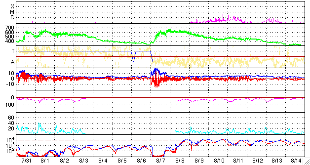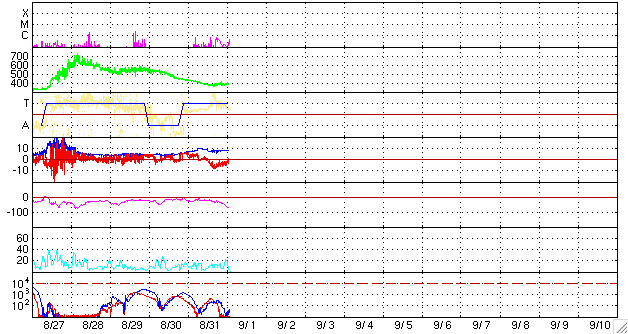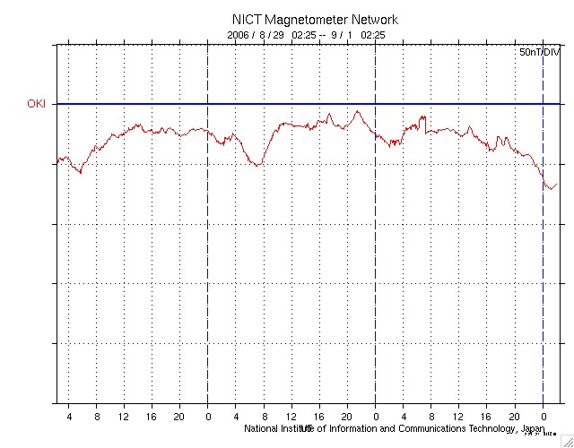 ACEが観測した太陽風の磁場(1番上の枠、白線は全体の強度、赤線は南北成分) および、太陽風の密度(3番目の橙線)、速度(4番目の黄線) (c) NOAA/SEC ![]() リアルタイムAE指数 下段のAEグラフの値が高くなると、オーロラ活動が活発化しています。 (c) 京都大学, NICT ![]() 沖縄の磁場擾乱 下へ下がるほど、擾乱が発達している事を意味します。 (c) NICT ![]() 27日の太陽周期に合わせたデータプロット 太陽が同じ面を地球に向けていた27日前の変化から、今後を予想することができます。 (c) NICT