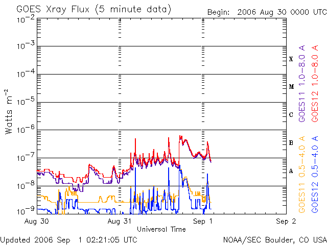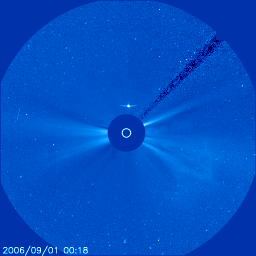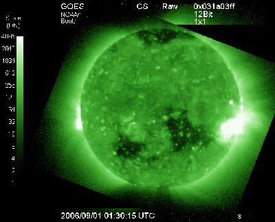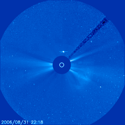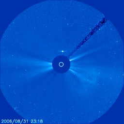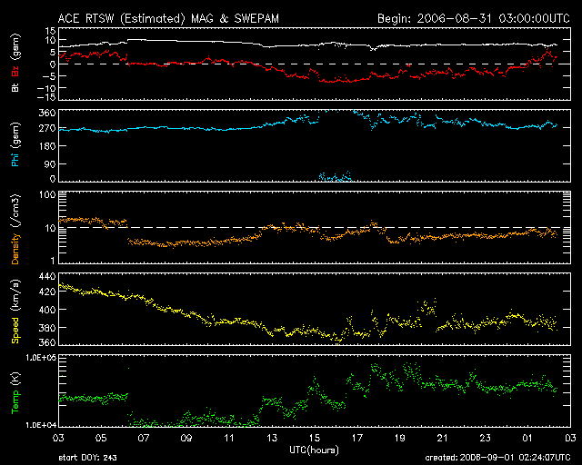 2006/ 9/ 1 11:25 更新 太陽風はやや遅くなっていますが(380km/秒)、南向き磁場が長時間続き、磁気圏が活動的になりました。 担当 篠原 昨日のACEのデータで見られた磁場の強まりは(ACEの図の白線)、 その後も8nTから10nTの範囲で強まったまま、現在まで続いています。 南北成分(赤線)を見ると、始め、北向き(プラス)だったものが、次第に0nT付近になり、 その後、南向き(マイナス)へと切り替わっています。 これは、太陽から飛び出した大きな磁場のかたまりが、 地球を通過する時に見られる変化とよく似ています。 磁場が大きくループを描いているために、 かたまりが地球を通過する時、磁場の方向がゆっくりと切り替わって行くのです。 こういう変化がやってくると、強い南向きが安定して続くことがあり、 磁気圏は乱れやすくなります。 今回も、速度は380km/秒とやや遅めになっているのですが、 -5nTくらいの南向きが延々と11時間くらい続いています。 このため、AE指数では1000nTに達する活発な変化が見えています。 Dst指数も-50nTの減少となっていて、弱い磁気嵐になっている様です。 太陽風磁場の南北成分は、現在は北向きに変わりつつあります。 磁気圏の活動は一段落となるでしょう。 さて、GOES13のX線写真では、コロナホールが太陽の西側に進んでいます。 位置的には、今後、いつ高速風が始まってもおかしくない場所に達しています。 その一方、27日前の太陽風を参照すると、高速風が来るのは明後日の3日になると予想されます。 昨日のニュースで比較しましたが、コロナホールが前回よりも強まっているように思われますので、 太陽風の変化は前周期と違っている可能性もあります。 いつから速度に変化が始まるのか、注目されます。 X線の動画が見られないため、詳細が分からないのですが、 太陽では、小さなフレア活動が活発に発生している様です。 905黒点群と、その左に小さく見える906黒点群(まだ番号はついていません)が起こしている様です。 このうちの、1日2時(世界時31日17時)頃に発生しているB7の小さなフレアでは、 小規模ですがCME(太陽ガスの放出現象)を起こしています。 SOHO LASCO C3の連続写真を掲載します。 太陽の西方向に飛び出していますので、地球への影響はないでしょう。 905群は、黒点群としては規模が縮小しつつあります。 新しい906黒点群も、まだ小さな黒点群です。 今のところは、Cクラスの小規模フレアを起こす程度と思われます。 GOES13衛星のX線カメラで撮影した太陽の様子。1日10時半(世界時1日1時半)。元の写真はやや左に傾いているようです。 (c) NOAA/SEC ![]() SOHO衛星のLASCO C3カメラの映像 (c) SOHO (ESA & NASA)