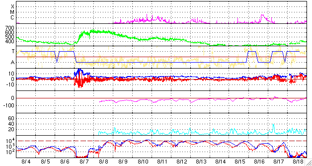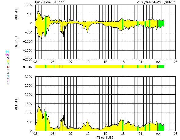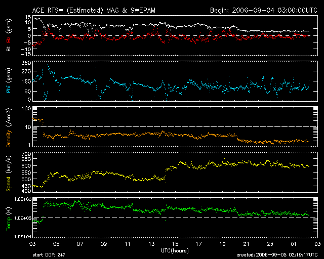 2006/ 9/ 5 11:21 更新 地球は高速の太陽風領域に入っています(600km/秒)。活発なオーロラ活動も見られています。 担当 篠原 昨日のニュース以降、太陽風の速度は上昇を続け、 600km/秒の高速状態になっています。 ACEの図を見ると(黄色線)、2段階で不連続な上昇の仕方をしています。 一方、昨日、15nTまで強まった磁場強度ですが、こちらはあっさりと弱まって、 速度が550km/秒に上がった、昨日、4日13時(世界時4日4時)頃に8nTくらいに下がり、 更に、速度が600km/秒を超えた後、5nTを切るまでに弱まっています。 このことより、速度は上昇を終え、現在が最も高速の領域に入っていると思われます。 速度が上がり始めの、磁場強度が強かった頃(今日の図の先頭部分)に、 AE指数で1300nTに達する、激しいオーロラ活動が見られています。 太陽風の磁場が-7nT近い南向きになっていたためです。 その後は、速度は上がりましたが、磁場強度が弱まって、 大きな南向きにならなくなったため、 オーロラの活動は500nT前後に留まっています。 それでも、連続的に活動が続いているのは、高速領域ならではです。 GOESのX線写真を見ると、 コロナホールは既に太陽の西の端に遠くなってしまいました。 27日周期の図を見ると、高速風の始まりは1日遅くなっています。 終わりも一日遅くなるのでしょうか、それとも、継続期間が短くなるのでしょうか。 コロナホールの位置はそれほど変化していないように見えたのですが、 高速風の分布はどうなっているのか、興味が持たれます。 また、太陽の中心から東よりのところに、 小さなコロナホールらしき影が見えています。 これは、前周期には無かったようです。 小さいのですが、赤道付近にあるので、地球へ多少影響が見られるかもしれません。 6日くらい先のことです。 太陽のフレア活動は概ね静穏です。 太陽の写真が更新されていないのですが、906黒点群が没して、 東端に白斑が見えているだけの、無黒点状態になっています。 活動は低いレベルが続くでしょう。 放射線帯の高エネルギー電子は、現在は低い状態です。 高速風の後半から、上昇が始まると予想されますので、 今後の変化に注目する必要があります。 GOES13衛星のX線カメラで撮影した太陽の様子。5日11時(世界時5日2時)。元の写真はやや左に傾いています。 (c) NOAA/SEC ![]() ACEが観測した太陽風の磁場(1番上の枠、白線は全体の強度、赤線は南北成分) および、太陽風の密度(3番目の橙線)、速度(4番目の黄線) (c) NOAA/SEC ![]() リアルタイムAE指数 下段のAEグラフの値が高くなると、オーロラ活動が活発化しています。 (c) 京都大学, NICT ![]() 27日の太陽周期に合わせたデータプロット 太陽が同じ面を地球に向けていた27日前の変化から、今後を予想することができます。 (c) NICT