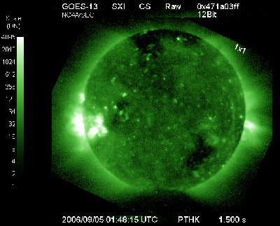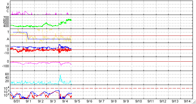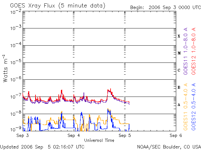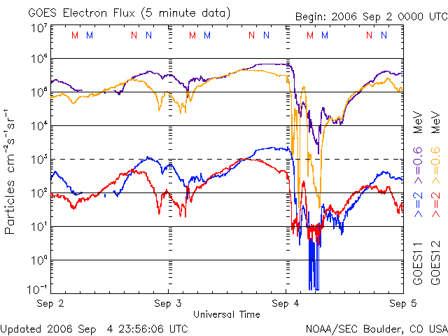 (c) SOHO (ESA & NASA) ![]() GOES衛星の太陽X線データ (c) NOAA/SEC ![]() GOES衛星による、静止衛星軌道における高エネルギー電子の変化 (c) NOAA/SEC ![]() | |||||||||||||||||||||||||||||||||||||||||||||||||||||||||||