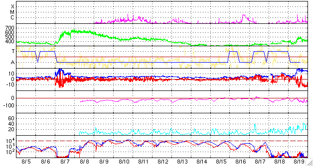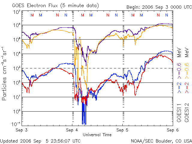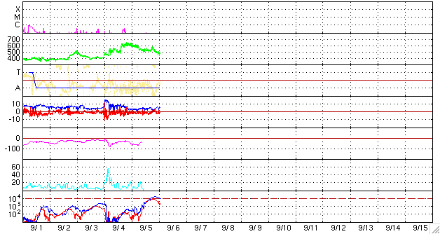 下段のAEグラフの値が高くなると、オーロラ活動が活発化しています。 (c) 京都大学, NICT ![]() GOES衛星による、静止衛星軌道における高エネルギー電子の変化 (c) NOAA/SEC ![]() SOHO衛星のMDIカメラによる太陽黒点 (c) SOHO (ESA & NASA) ![]() GOES衛星の太陽X線データ (c) NOAA/SEC ![]() | |||||||||||||||||||||||||||||||||||||||||||||||||||||||||||