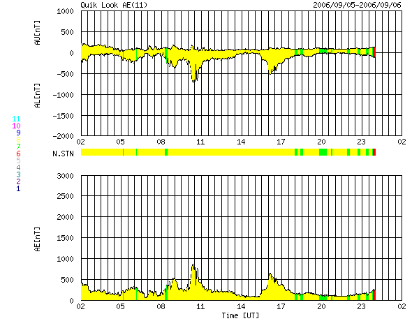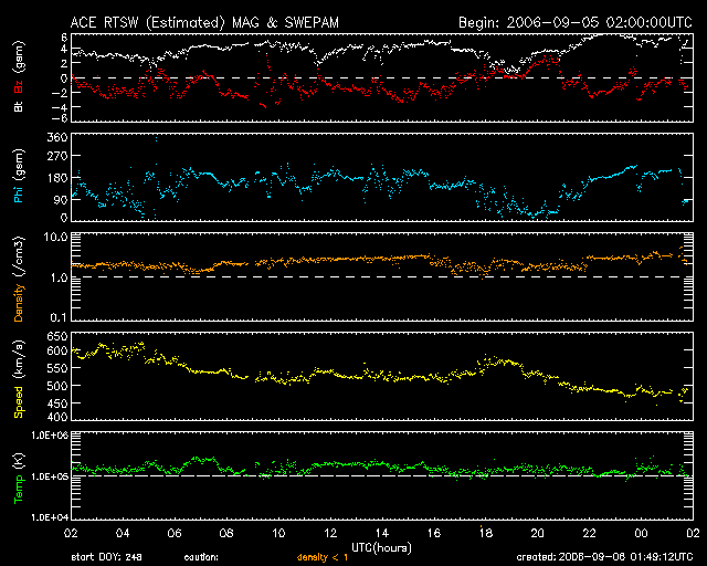 2006/ 9/ 6 10:51 更新 太陽風の速度は下がりつつあります(500km/秒)。弱いですが南向き磁場の影響で、活発なオーロラ活動が見られています。 担当 篠原 600km/秒に上昇していた太陽風の速度は、昨日のニュース以降ゆっくりと下がっています。 現在、500km/秒まで下がりました。 前周期は、600km/秒台が1日半くらい続いたのですが、今回は半日ほどに縮まりました。 27日周期の図を見ると、速度(緑色線)の山が前回(8月7日以降)よりも小さくなっているのが分かります。 地球は高速風帯の中央部は通り抜けましたが、 前周期はこの後も450km/秒くらいのやや高速の状態が3日ほど続きました。 今回も同様に、下がりそうで下がらないという変化になるかもしれません。 一方の太陽風磁場は、-2nTくらいの弱い南向きが連続して現れています。 このため、AE指数で500nTから800nTくらいの中規模のオーロラ活動が観測されました。 磁場の南向きが、振幅は小さいものの長い時間続いたことと、 速度が550km/秒と比較的高かったことが影響しているのでしょう。 現在は、速度が下がって来ていますので、 オーロラ活動は次第に小規模なものにとどまるようになると思われます。 さて、昨日も書きましたが、GOES13のX線写真を見ると太陽の中心やや東(左)に 小さなコロナホールが見えています。 明日くらいに太陽の中心に達しそうです。 このくらい小さいと目立った影響はなさそうですが、 太陽の真ん中にあるので、9月10-11日の太陽風に多少の変化が見られるかもしれません。 前周期には見られなかったコロナホールですので、変化の様子が楽しみです。 放射線帯の高エネルギー電子が一気に数を増しています。 グラフでは一気に10の4乗の線に到達しています。 衛星の運用では障害が発生しやすくなっています。 明日にかけてさらに増大する可能性もあります。 今後の変化に注目してください。 また、増加は急ですが、減少はたいへんゆっくりです。 これから数日間にわたって、警戒状態が続くと予想されます。 太陽のフレア活動は穏やかです。 黒点の写真が更新されていないのですが、 東の端から907、908と二つの黒点群が現れているそうです。 ただし、GOESのX線動画を見ると、活発に活動している様子は見られません。 引き続き穏やかなままでしょう。 GOES13衛星のX線カメラで撮影した太陽の様子。6日10時(世界時6日1時)。元の写真はやや左に傾いています。 (c) NOAA/SEC ![]() ACEが観測した太陽風の磁場(1番上の枠、白線は全体の強度、赤線は南北成分) および、太陽風の密度(3番目の橙線)、速度(4番目の黄線) (c) NOAA/SEC ![]() 27日の太陽周期に合わせたデータプロット 太陽が同じ面を地球に向けていた27日前の変化から、今後を予想することができます。 (c) NICT
