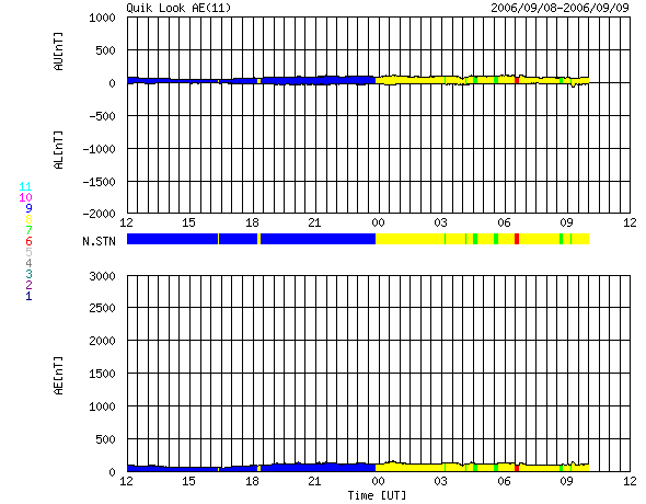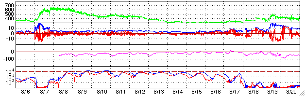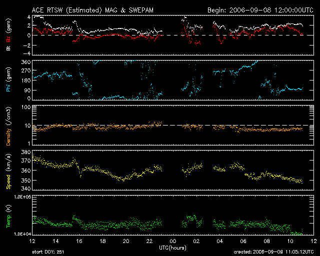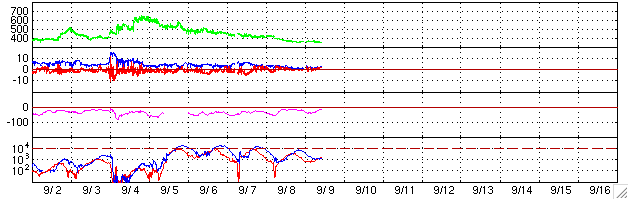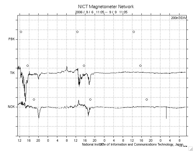 2006/ 9/ 9 20:07 更新 太陽風速度が減速しています。磁気圏は静穏です。 担当 北村 太陽風速度はさらに減速を続けており、現在350km/秒程度まで 下がってきています。 太陽風磁場の南北成分(赤い線)はゼロ付近で北向きと南向き と切り替わりながら変化していますが、強度は2nT程度で 非常に弱い状態です。 これによって磁気圏の活動も大変に静穏な状態となっています。 AE指数やシベリア磁場データを見ますと、まったくオーロラ活動が ない事が分かります。 太陽活動ですが、黒点群907,908,909の活動によって、 Bクラスの弱い太陽フレアが発生していますが、 特に地球に影響を与えるものではなく、 全般的に静穏な状態で推移しています。 高速太陽風の影響で、静止軌道の高エネルギー電子の量が 警戒レベルまで増加していましたが、本日に入って 徐々に減少してきました。今後はさらに減少するものと 思われます。 ACEが観測した太陽風の磁場(1番上の枠、白線は全体の強度、赤線は南北成分) および、太陽風の密度(3番目の橙線)、速度(4番目の黄線) (c) NOAA/SEC ![]() リアルタイムAE指数 下段のAEグラフの値が高くなると、オーロラ活動が活発化しています。 (c) 京都大学, NICT ![]() シベリアで観測された3日間の磁場データ 右側の3分の1が、昨日のデータになります。グラフが上がったり下がったりすると、オーロラ活動が活発化しています。 (c) NICT ![]() SOHO衛星のMDIカメラによる太陽黒点 (c) SOHO (ESA & NASA) ![]() GOES衛星の太陽X線データ (c) NOAA/SEC ![]() 27日の太陽周期に合わせたデータプロット (放射線帯電子版) 太陽が同じ面を地球に向けていた27日前の変化から、今後を予想することができます。 (c) NICT