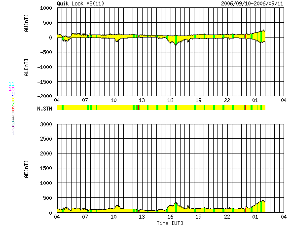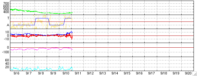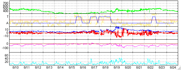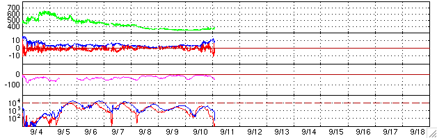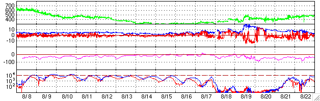 下段のAEグラフの値が高くなると、オーロラ活動が活発化しています。 (c) 京都大学, NICT ![]() 沖縄の磁場擾乱 下へ下がるほど、擾乱が発達している事を意味します。 (c) NICT ![]() シベリアで観測された3日間の磁場データ 右側の3分の1が、昨日のデータになります。グラフが上がったり下がったりすると、オーロラ活動が活発化しています。 (c) NICT ![]() 27日の太陽周期に合わせたデータプロット (放射線帯電子版) 太陽が同じ面を地球に向けていた27日前の変化から、今後を予想することができます。 (c) NICT
