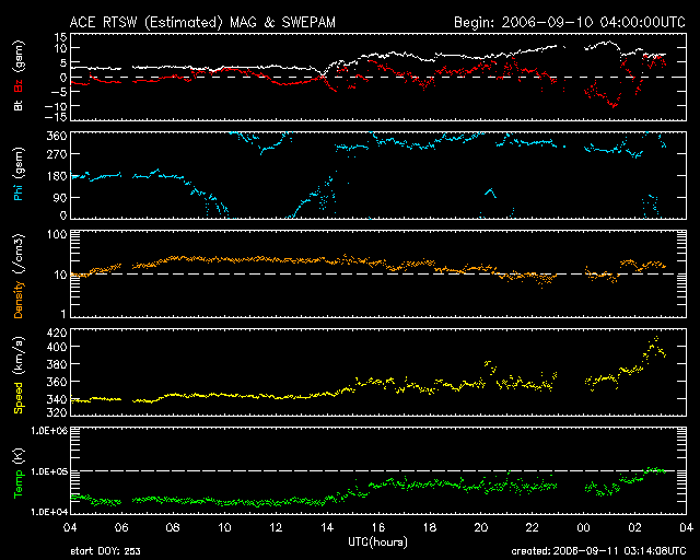 2006/ 9/11 12:17 更新 太陽風速度がやや上昇傾向に転じ、磁場強度も強まりました。 担当 北村 先日から減少し続けた太陽風速度ですが、本日に入って減少が底を打ち やや上昇傾向に転じたように見えます。これに伴って、太陽風の磁場強度は 急激に強くなり、南北成分は現在10nT以上の南向きとなっています。 しかし、前周期と比較すると前周期では今頃のタイミングでは高速太陽風 は到来しておらず、今周期で急激にコロナホールの状況が変化した可能性が あります。GOES13の画像を見ると西の端(向かって右)にコロナホール らしき黒い領域が見えますので、これが原因かもしれません。 磁気圏は、AE指数がやや上昇しかけており、沖縄磁場変動を見ると やや磁場が減少してきており、磁気圏が少し荒れてきている兆しがありますが、 現状では磁気嵐のような大きな擾乱には発達していません。 今後、太陽風の磁場が南を向き続けるとさらに擾乱が強くなると思われるので、 太陽風の変化に注意が必要です。 太陽面の活動は、GOESのX線のグラフでは特に大きなフレアは発生していません。 静止軌道の高エネルギー電子のフラックスも減少してきています。 GOES13による太陽のX線画像 (c) NOAA/SEC ACEが観測した太陽風の磁場(1番上の枠、白線は全体の強度、赤線は南北成分) および、太陽風の密度(3番目の橙線)、速度(4番目の黄線) (c) NOAA/SEC ![]() 27日の太陽周期に合わせたデータプロット (太陽風版) 太陽が同じ面を地球に向けていた27日前の変化から、今後を予想することができます。 (c) NICT