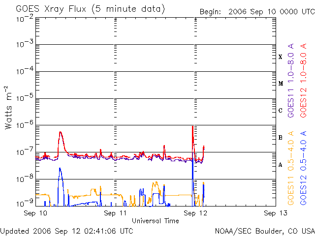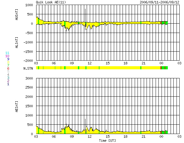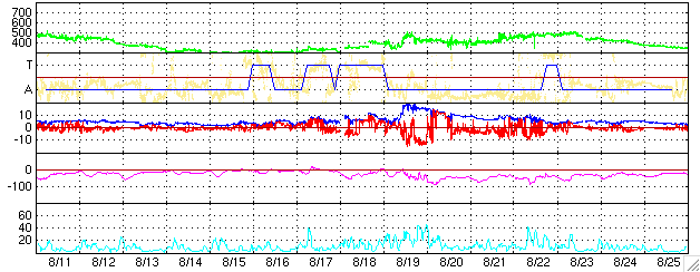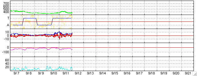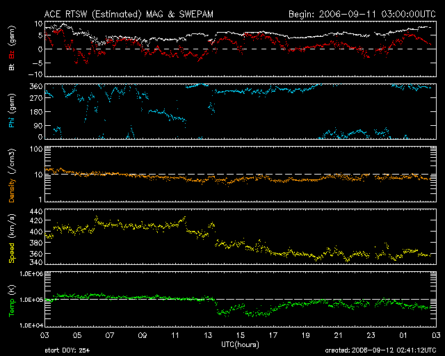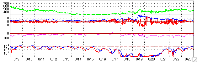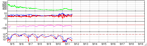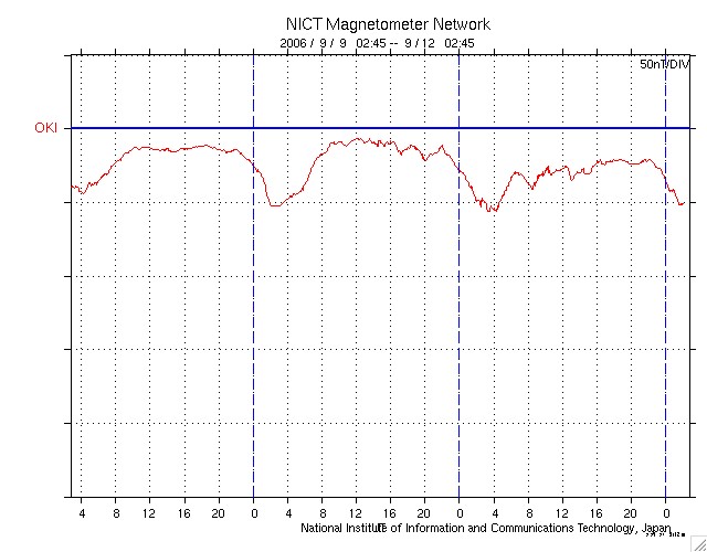 2006/ 9/12 11:44 更新 太陽風擾乱は収束に向かっており、磁気圏は静穏です。 担当 北村 昨日、少し擾乱が見られた太陽風ですが本日に入り収束に向かっています。 太陽風速度は、いったん420km/秒まで上昇しましたが現在は再び350km/秒 まで下がっています。 太陽風磁場の状態も、10nTから5nT程度に下がりましたが、現在 再び増加傾向にあるように見えます。 しかし、太陽表面には特に目立った構造は見られないので、 今後数日は静穏な状態が続くと思われます。 GOES13の太陽画像を見ると、東の方(向かって左)に暗いコロナホールが 見えます。これが、西側へ回ってきた頃に、ここから噴出す高速太陽風の 影響が地球近傍で観測されると思われます。 AE指数のグラフやシベリア磁場データを見ると、500nT程度の弱いオーロラ活動が みられるものの目立った大きな変動は見られず静穏な状態が続いています。 太陽表面では黒点群908からC1.1のフレアが発生しています。 今後、Cクラス程度のフレアは発生する可能性がありますが、 とりわけ警戒が必要なほどの大きなフレアは発生しないと思われます。 GOESの静止軌道の高エネルギー電子フラックスもさらに低下を続け 現在では通常レベルまで下がっています。 GOES13による太陽のX線画像 (c) NOAA/SEC ACEが観測した太陽風の磁場(1番上の枠、白線は全体の強度、赤線は南北成分) および、太陽風の密度(3番目の橙線)、速度(4番目の黄線) (c) NOAA/SEC ![]() リアルタイムAE指数 下段のAEグラフの値が高くなると、オーロラ活動が活発化しています。 (c) 京都大学, NICT ![]() シベリアで観測された3日間の磁場データ 右側の3分の1が、昨日のデータになります。グラフが上がったり下がったりすると、オーロラ活動が活発化しています。 (c) NICT ![]() 沖縄の磁場擾乱 下へ下がるほど、擾乱が発達している事を意味します。 (c) NICT ![]() GOES衛星の太陽X線データ (c) NOAA/SEC ![]() 27日の太陽周期に合わせたデータプロット (放射線帯電子版) 太陽が同じ面を地球に向けていた27日前の変化から、今後を予想することができます。 (c) NICT