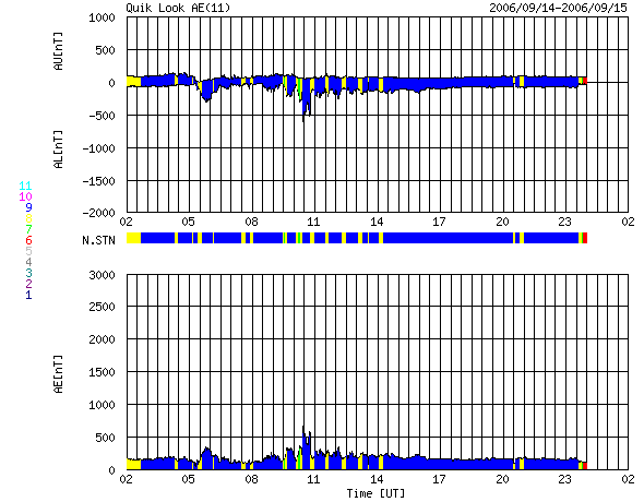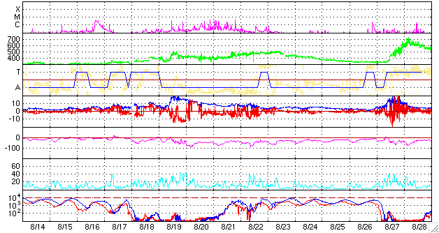 ACEが観測した太陽風の磁場(1番上の枠、白線は全体の強度、赤線は南北成分) および、太陽風の密度(3番目の橙線)、速度(4番目の黄線) (c) NOAA/SEC ![]() リアルタイムAE指数 下段のAEグラフの値が高くなると、オーロラ活動が活発化しています。 (c) 京都大学, NICT ![]() 27日の太陽周期に合わせたデータプロット 太陽が同じ面を地球に向けていた27日前の変化から、今後を予想することができます。 (c) NICT