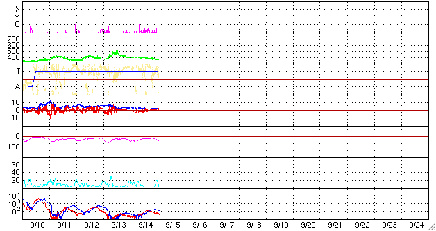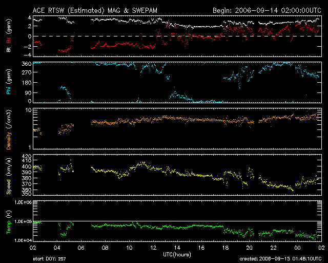 2006/ 9/15 10:52 更新 太陽風の速度は下がっています(370km/秒)。明日、明後日頃から小規模コロナホールの影響がみられるかもしれません。 担当 篠原 この数日、太陽風の速度が不規則に上下していましたが、 昨日以降は400km/秒から370km/秒へ、ゆっくりと低下を続けています。 太陽風磁場の強度も3nTと弱まっていおり、太陽風の乱れは一段落着くのではないでしょうか。 太陽風磁場の南北成分を見ると、ACEの図の前半で-2nTくらいの弱い南向きが続いています。 速度も400km/秒と通常の速度はあり、多少のオーロラ活動が見られそうなのですが、 AE指数のグラフでは、500nTの小規模の変化が一回と、 後は小刻みな変化が発生している程度で、比較的穏やかな印象です。 図の後半以降は磁場が北向きとなったため、磁気圏は穏やかになっています。 さて、GOES13のX線画像を見ると、太陽の中心やや西寄りに小さなコロナホールが見えています。 このコロナホールは、27日前のSOHOの画像でも見ることができます。 中心線から西側にやや行き過ぎたくらいにあるため、 明日、明後日くらいから地球へ影響が及ぶ可能性があります。 こういう時に、27日周期の図が役に立つのですが、今回は少し注意が必要です。 27日前の8月19日に太陽風磁場が急に強まり、速度が500km/秒に上昇する変化が見えています。 これは、その3日前(8月16日)に発生したCMEによって起こった乱れです。 このタイプの太陽風の変化には周期性がありません。 その後の8月21日あたりから、速度がゆるやかに上がっていますが、 こちらがコロナホールと関係した変化ではないかと思います。 これに相当する日付は、明後日の9月17日です。 太陽では、没しかけている909黒点群がC1の小さな小規模フレアを起こし、 908群もBクラスのとても小さなフレアを起こしました。 いずれも小さなもので、基本的に太陽は穏やかに推移しています。 GOES13衛星のX線カメラで撮影した太陽の様子。15日10時(世界時15日1時)。元の写真はやや左に傾いています。 (c) NOAA/SEC ![]() SOHO衛星のEIT284カメラの映像 (c) SOHO (ESA & NASA)