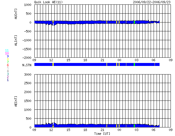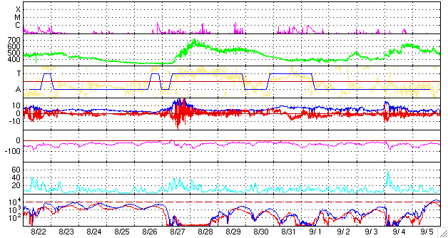 ACEが観測した太陽風の磁場(1番上の枠、白線は全体の強度、赤線は南北成分) および、太陽風の密度(3番目の橙線)、速度(4番目の黄線) (c) NOAA/SEC ![]() リアルタイムAE指数 下段のAEグラフの値が高くなると、オーロラ活動が活発化しています。 (c) 京都大学, NICT ![]() 27日の太陽周期に合わせたデータプロット 太陽が同じ面を地球に向けていた27日前の変化から、今後を予想することができます。 (c) NICT