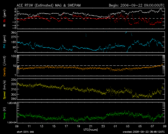 2006/ 9/23 17:56 更新 太陽風はとても低速です(300km/秒)。910黒点群が小さなフレア活動を続けています。間もなく高速太陽風が来るでしょう。 担当 篠原 高速の太陽風はまだ来ていません。 太陽風の速度は、昨日の320km/秒から更に下がって、 300km/秒とかなり遅くなっています。 磁場強度も弱く、2nT前後が続いていました。 このため、磁気圏の活動はとても穏やかで、 オーロラの活動を示すAE指数のグラフには全く変化が見られていません。 ACEの最新(右寄り)の時間帯を見ると、 とてもわずかな変化ですが、磁場強度が4nT前後へ強まっているように見えます。 27日周期の図を見ると、強まった様子がやや分かりやすいと思います。 まだ断定できる段階ではありませんが、 コロナホールの位置から考えて、高速風はそろそろ到来するはずですので、 この後、更に磁場強度の強まりが続き、 やがて速度が上がり始めるのではないかと予想されます。 磁場強度が強まって、速度が上がった頃に 南向き磁場がやってくると、オーロラ活動が一気に強まります。 今後の太陽風の変化に注意して下さい。 放射線帯の高エネルギー電子はやや減少していますが、 依然、警戒ラインを超えたレベルで推移しています。 衛星の運用では引き続き注意が必要です。 太陽では、真ん中付近に910黒点群がとても小さな姿を見せています。 しかし、X線の変化で見ると、意外と活発で、 Bクラスと規模は小さいですが、激しく変動を繰り返しています。 そのうち、23日9時(世界時23日0時)の活動はC1に達している様です。 これ以上大きな活動になることは考えにくいですが、 現在程度の活動は続く可能性があります。 GOESのX線動画のページが停止しているようで、ちょっと状況が分かりにくいです。 先ほどロシアより帰国しました。 帰りの電車の中で更新しています。 明日からは通常の更新ペースに戻ります。 SOHO衛星のEIT284カメラの映像 (c) SOHO (ESA & NASA)