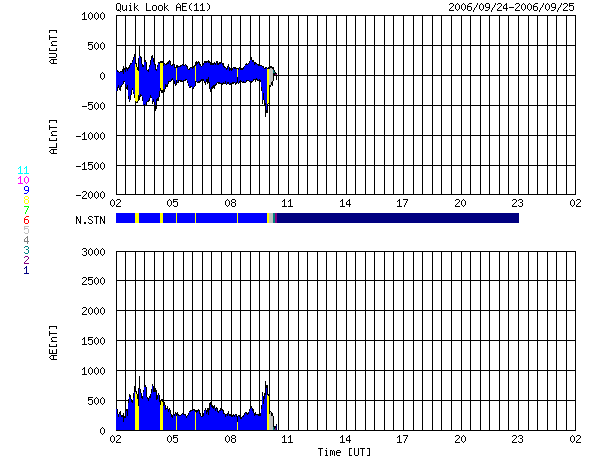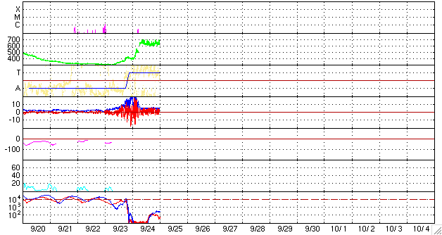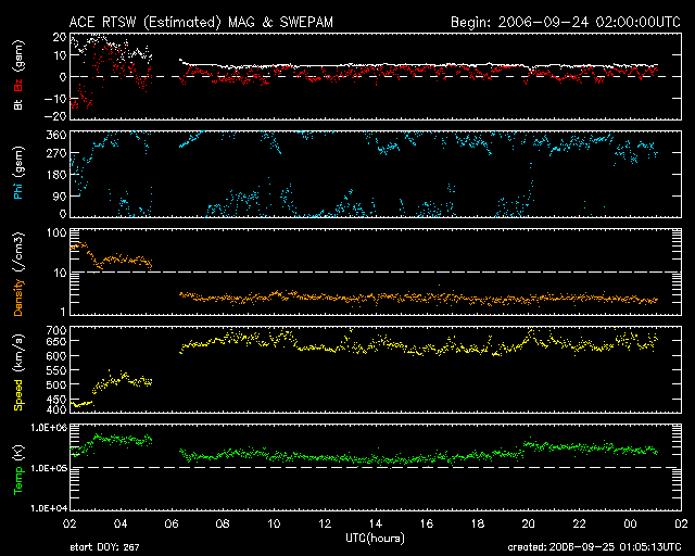 2006/ 9/25 10:06 更新 太陽風の速度は650km/秒とかなり高速です。オーロラ活動も活発に見られています。 担当 篠原 昨日のニュース更新直後の24日15時(世界時24日6時)に、 太陽風の速度は一気に650km/秒まで上昇しました(ACEの図の黄色線)。 その後現在まで、このかなりの高速状態が安定して続いています。 一方、太陽風の磁場強度(白線)は、速度の上昇とぼぼ同時に10nTから5nTへ一気に弱まり、 粒子の密度(橙色線)も20個/ccから2個/ccへ一気に下がりました。 地球は高速風領域の中心部分に入ったと考えられます。 今日のACEの図では、太陽風磁場の南北成分(赤線)は、 幅がとても小さくなってしまっていて、変化がよく分かりません。 比較的北寄り(プラスの方向)に推移しているように見えますが、 速度がかなり高まっているため、磁気圏活動は活発に推移しています。 図が前半だけになってしまっていますが、 AE指数は800nT前後の変化が記録されています。 シベリアの磁場データでも、AEに続く時間帯に、 TIKで600nTくらいの変動が記録されていて、活発な活動が続いていたことを示しています。 現在もたいへん太陽風が速い状態が続いていますので、 引き続き活発なオーロラ活動が続く可能性があります(太陽風磁場の状態によります)。 27日前の、太陽の同じ面が地球を向いていた時を参考にすると、 この時は、高速風は3日ほど続きました(8/27-8/30)。 今周期も同程度と考えると、明日いっぱい高速状態が続くと予想されます。 GOES13のX線画像で、今回の高速風の発生源であるコロナホールが、 西の端(左の端)のほうに見えています。 放射線帯の高エネルギー電子は、現在は低いレベルです。 高速風の後半から、急に増加する可能性があります。 明日以降の変化に注目する必要があるでしょう。 太陽では、910黒点群がとてもかすかになっていて、 今日の写真では姿を見つけることができません。 消えつつある様です。 フレア活動も目立ったものはなく、太陽は静穏な状態です。 GOES13衛星のX線カメラで撮影した太陽の様子。25日9時半(世界時25日0時半)。元の写真はやや左に傾いています。 (c) NOAA/SEC ![]() ACEが観測した太陽風の磁場(1番上の枠、白線は全体の強度、赤線は南北成分) および、太陽風の密度(3番目の橙線)、速度(4番目の黄線) (c) NOAA/SEC ![]() リアルタイムAE指数 下段のAEグラフの値が高くなると、オーロラ活動が活発化しています。 (c) 京都大学, NICT ![]() シベリアで観測された3日間の磁場データ 右側の3分の1が、昨日のデータになります。グラフが上がったり下がったりすると、オーロラ活動が活発化しています。 (c) NICT ![]() 27日の太陽周期に合わせたデータプロット 太陽が同じ面を地球に向けていた27日前の変化から、今後を予想することができます。 (c) NICT