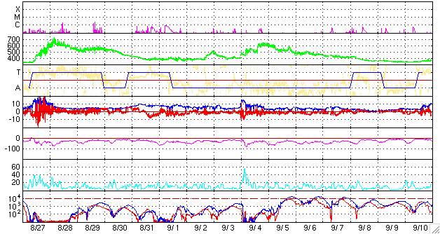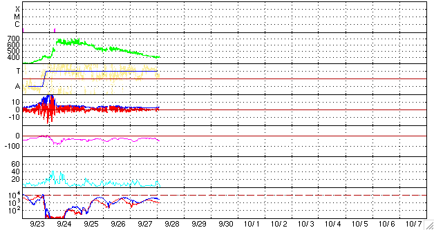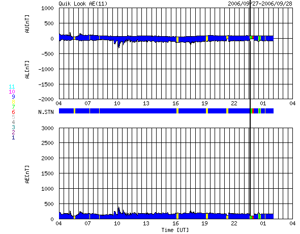 ACEが観測した太陽風の磁場(1番上の枠、白線は全体の強度、赤線は南北成分) および、太陽風の密度(3番目の橙線)、速度(4番目の黄線) (c) NOAA/SEC ![]() リアルタイムAE指数 下段のAEグラフの値が高くなると、オーロラ活動が活発化しています。 (c) 京都大学, NICT ![]() 27日の太陽周期に合わせたデータプロット 太陽が同じ面を地球に向けていた27日前の変化から、今後を予想することができます。 (c) NICT