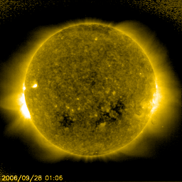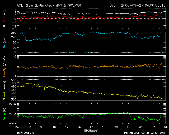 2006/ 9/28 12:33 更新 太陽風は通常の速度レベルにもどりました(400km/秒)。オーロラ活動も静穏です。 担当 篠原 太陽風の速度は下がり続け、通常の速度に戻りました。 昨日のニュースでは460km/秒でしたが、 その後もゆっくり下がり続けて、現在は400km/秒になっています。 太陽風は、これから明後日くらいまで、このまま穏やかな状態が続くでしょう。 前周期は400km/秒のままでしたので、 今回もこれ以上は下がらないかもしれません。 太陽風の磁場は3nTとやや弱めです。 南北成分はほぼ0nTか、小さくですがやや北寄りに見えます。 速度が下がって、磁場の南向きもほとんど見られないので、 オーロラ活動はとても穏やかになっています。 AE指数のグラフを見ると、ほとんど変化が見られません。 SOHOのEIT284の太陽写真を見ると、南半球にコロナホールが2カ所見られます。 西側(右側)のコロナホールが、この後地球に影響を及ぼし始めます。 9月30日か10月1日くらいから、太陽風に変化が始まるでしょう。 コロナホールの位置が南側に寄っているためでしょう、 前周期の変化では、地球へ届いた高速風の規模はそれほど大きくありませんでした。 太陽は911黒点群の番号が書いてありますが、 今日の写真では黒点そのものは見つけることができません。 とても小さな黒点群の様です。 X線のグラフはレベルがかなり下がっていて、変化もほとんどありません。 太陽はとても穏やかな状態です。 放射線帯の高エネルギー電子は、警戒ライン(10の4乗の線)よりも下ですが、 やや高めの状態が続いています。 SOHO衛星のEIT284カメラの映像 (c) SOHO (ESA & NASA)