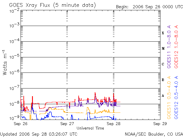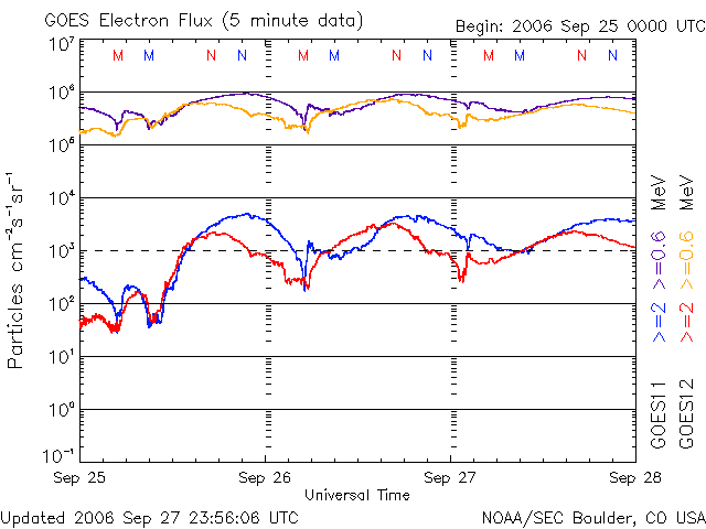 (c) SOHO (ESA & NASA) ![]() GOES衛星の太陽X線データ (c) NOAA/SEC ![]() GOES衛星による、静止衛星軌道における高エネルギー電子の変化 (c) NOAA/SEC ![]() | ||||||||||||||||||||||||||||||||||||||||||||||||||||||||||||