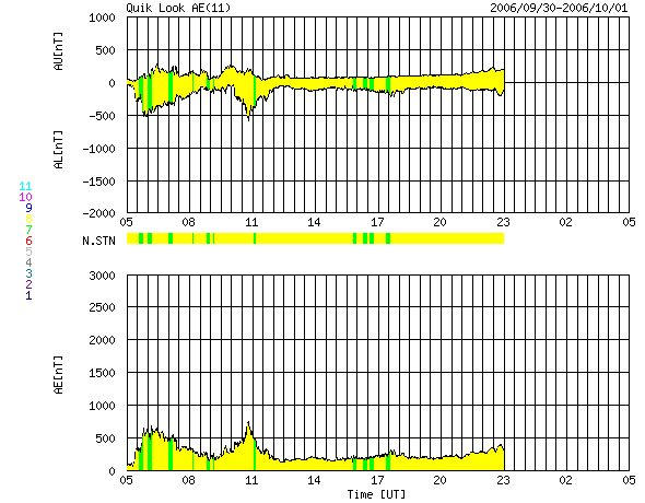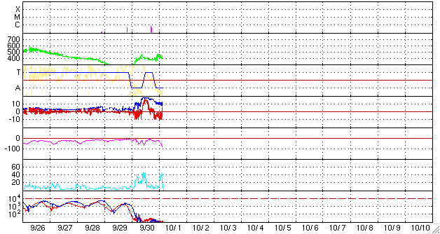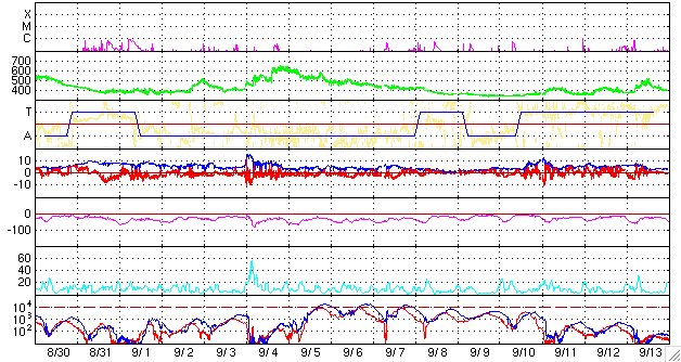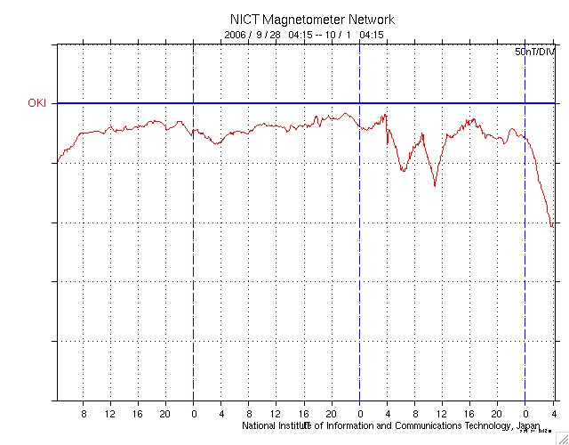 ACEが観測した太陽風の磁場(1番上の枠、白線は全体の強度、赤線は南北成分) および、太陽風の密度(3番目の橙線)、速度(4番目の黄線) (c) NOAA/SEC ![]() リアルタイムAE指数 下段のAEグラフの値が高くなると、オーロラ活動が活発化しています。 (c) 京都大学, NICT ![]() 沖縄の磁場擾乱 下へ下がるほど、擾乱が発達している事を意味します。 (c) NICT ![]() 27日の太陽周期に合わせたデータプロット 太陽が同じ面を地球に向けていた27日前の変化から、今後を予想することができます。 (c) NICT