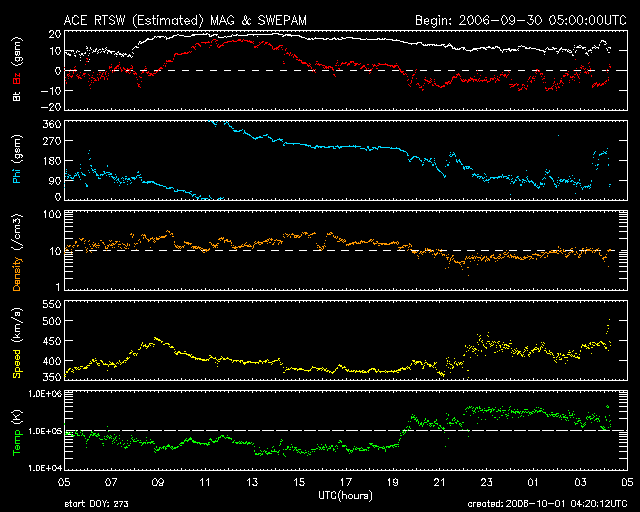 2006/10/ 1 13:20 更新 太陽風に乱れが始まっています。しかし、速度はまだ通常のレベルです。この後の変化に注目してください。 担当 篠原 太陽風に乱れが始まりました。 30日12時(世界時30日3時)ころから太陽風の磁場が10nTに強まりました。 30日17時(世界時30日8時)からはもう一段強まって、20nT近くにまでかなり強まりました。 その後、ゆっくりと磁場強度は下がって、現在は10nTです(依然強まった状態です)。 磁場の変化と歩調を合わせるように、太陽風の速度も変化しました。 ただ、その幅は小さく、300km/秒だった速度が400〜440km/秒に上がった程度です。 これは普段の速度と言えるレベルで、高速風にはなっていません。 27日周期の図を見ると、前周期も、高速風の始まりは2段階みたいになっていて、 高速風の構造が単純ではありませんでした。 今回も、この後から本格的に速度が上がる様な変化が始まるのかもしれません。 今日一日、太陽風の様子に注目する必要があるでしょう。 ACEの図の後半から、太陽風磁場が南寄りになっています。 磁場強度が上がっているため、-5nTから、強い時は-10nT近くまで南向きになっています。 速度がそれほど高まっていませんので、大きな変動にはなりにくいですが、 それなりに活発な磁気圏活動が発生しているのではないでしょうか。 掲載しているAE指数のグラフでは、後半のデータが欠けていて、極域の状況はまだ分かりません。 沖縄の磁場データを見ると、磁場強度が前日と比較して-80nTくらい下がっています。 沖縄だけでは正確な判断はできませんが、弱い磁気嵐にはなっている様です。 この後も、磁場強度が強いまま南を向いたり、速度が上昇を始めたりすると、 オーロラ活動が活発になりやすくなります。 明後日くらいまで、活動的な状態が続く可能性があります。 太陽では黒点がぽつぽつと見えています。 915黒点群に番号が書かれています。 ここが、Cにやや届かないBクラスの小さなフレアを起こしています。 今のところ、黒点群たちの規模はどれも小さく、 太陽のフレア活動は穏やかな状態が続きそうです。 放射線帯の高エネルギー電子は、太陽風の乱れの影響で、 一気に数を減らしています。 しかし、これから高速風が始まると、その後再び増加を始めるでしょう。 太陽風の変化も併せて注視してください。 SOHO衛星のEIT284カメラの映像 (c) SOHO (ESA & NASA)