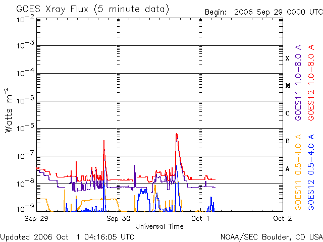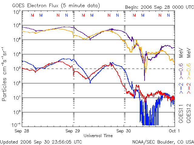 (c) SOHO (ESA & NASA) ![]() GOES衛星の太陽X線データ (c) NOAA/SEC ![]() GOES衛星による、静止衛星軌道における高エネルギー電子の変化 (c) NOAA/SEC ![]() | ||||||||||||||||||||||||||||||||||||||||||||||||||||||||||||