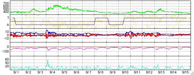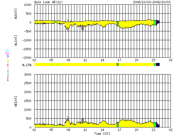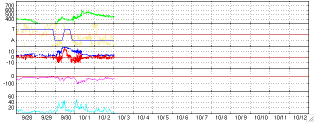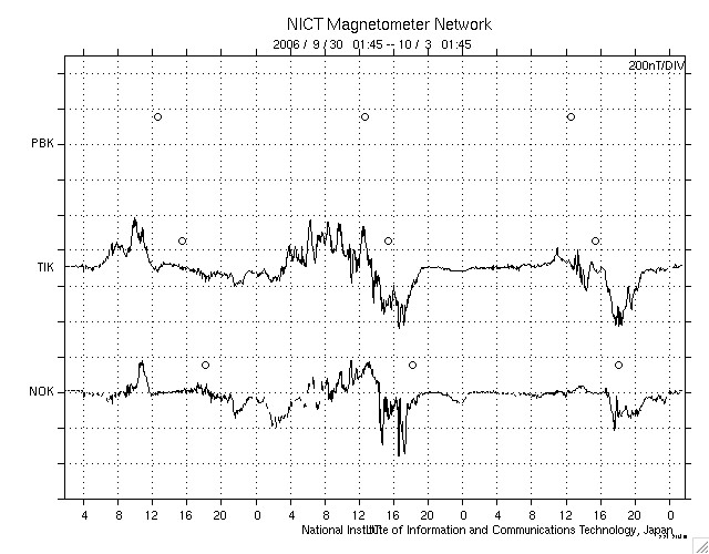ACEが観測した太陽風の磁場(1番上の枠、白線は全体の強度、赤線は南北成分) および、太陽風の密度(3番目の橙線)、速度(4番目の黄線) (c) NOAA/SEC ![]() リアルタイムAE指数 下段のAEグラフの値が高くなると、オーロラ活動が活発化しています。 (c) 京都大学, NICT ![]() シベリアで観測された3日間の磁場データ 右側の3分の1が、昨日のデータになります。グラフが上がったり下がったりすると、オーロラ活動が活発化しています。 (c) NICT ![]() GOES衛星の太陽X線データ (c) NOAA/SEC ![]() GOES衛星による、静止衛星軌道における高エネルギー電子の変化 (c) NOAA/SEC ![]() 27日の太陽周期に合わせたデータプロット (太陽風版) 太陽が同じ面を地球に向けていた27日前の変化から、今後を予想することができます。 (c) NICT