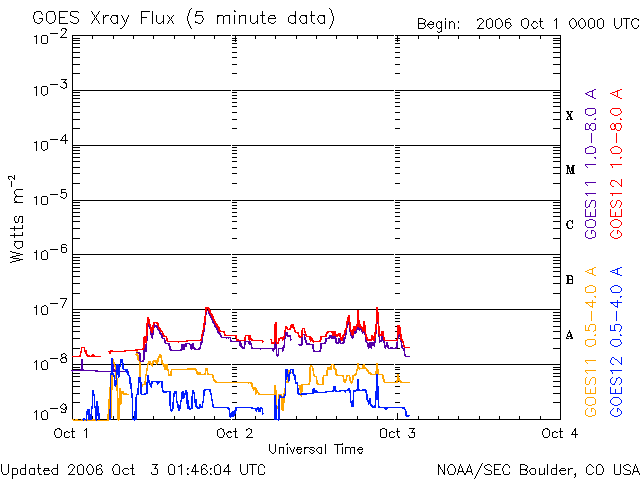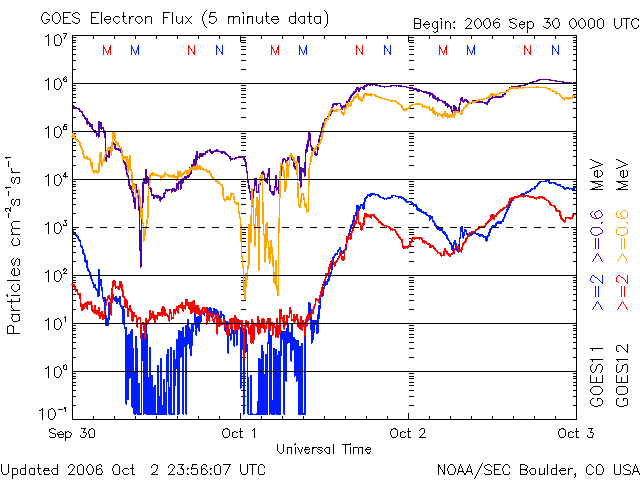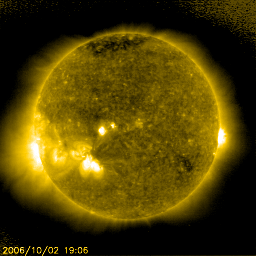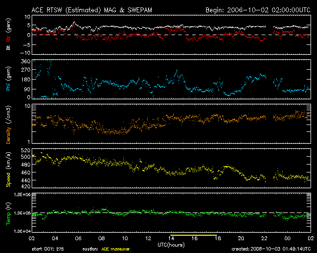 2006/10/ 3 10:50 更新 太陽風速度が緩やかに減少しています。静止軌道の高エネルギー電子が増えています。 担当 北村 太陽風速度は引き続き緩やかに減少しており、現在450km/秒程度になっています。 太陽風磁場の南北成分は、2-3nT程度で北向と南向きを切り替わりながら推移しています。 磁気圏は基本的には静穏ですが、太陽風の速度がやや速いためオーロラ活動が 多少活発になっています。 AE指数やシベリア磁場データを見ると、最大で500nT程度の弱いオーロラ活動が 継続していることが分かります。 太陽面の状態は静穏な状態で、GOESのX線のグラフを見ても目立った フレアーは発生していません。 一方で、太陽風速度が速い状態が続いているために、静止軌道での 高エネルギー電子のフラックス量が上昇しています。 本日、警戒レベルである、10の4乗のレベルを超えていますので、 衛星運用等には注意が必要でしょう。 今後は、太陽風の速度の減少に伴って全体に静穏になってゆくと思われます。 SOHO衛星のEIT284カメラの映像 (c) SOHO (ESA & NASA)