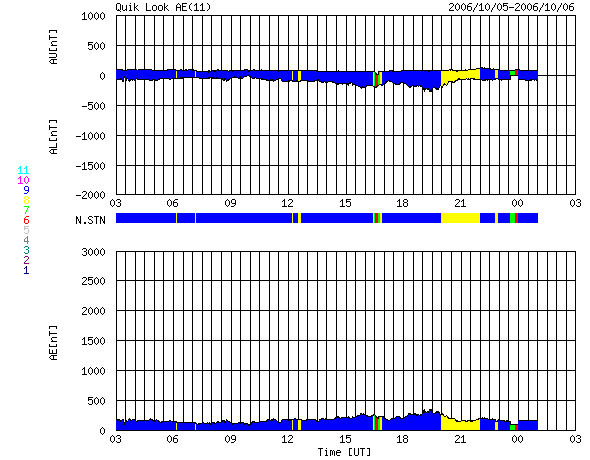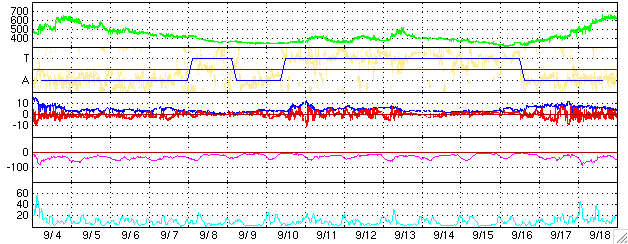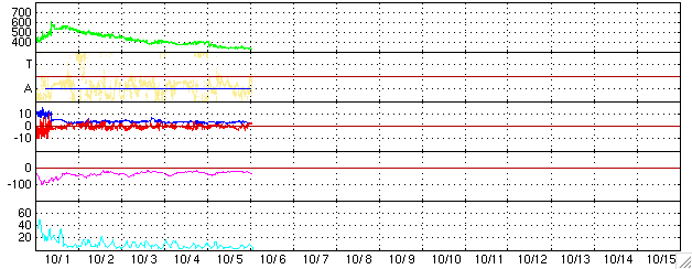 ACEが観測した太陽風の磁場(1番上の枠、白線は全体の強度、赤線は南北成分) および、太陽風の密度(3番目の橙線)、速度(4番目の黄線) (c) NOAA/SEC ![]() リアルタイムAE指数 下段のAEグラフの値が高くなると、オーロラ活動が活発化しています。 (c) 京都大学, NICT ![]() SOHO衛星のMDIカメラによる太陽黒点 (c) SOHO (ESA & NASA) ![]() GOES衛星の太陽X線データ (c) NOAA/SEC ![]() GOES衛星による、静止衛星軌道における高エネルギー電子の変化 (c) NOAA/SEC ![]() 27日の太陽周期に合わせたデータプロット (太陽風版) 太陽が同じ面を地球に向けていた27日前の変化から、今後を予想することができます。 (c) NICT