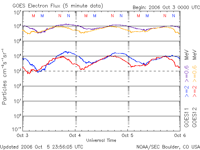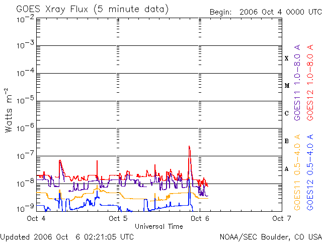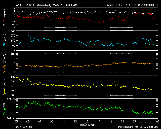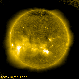 2006/10/ 6 11:25 更新 太陽風、磁気圏ともに静穏な状態が続いています。 担当 北村 太陽風の速度は、320km/秒程度まで減速しており依然として静穏な状態が 継続しています。太陽風磁場の南北成分もほぼ0付近で推移しており、 磁気圏へのエネルギー流入は非常に少ない状態です。 AE指数をみてもオーロラの活動は非常に低調で、平均して200nT程度で 推移しています。 太陽表面では、活動領域の913と914がまだ正面付近に位置しています。 GOESのX線のグラフを見ると、5日の21時UT頃にB2.6の小さなフレアが 発生していますが、これは活動領域914で発生したものでした。 フレアとしては非常に小規模なものなので特に警戒は必要ないと思いますが、 今後、この活動領域が拡大するのかどうか注目する必要がありそうです。 静止軌道の高エネルギー電子は、昨日も警戒レベルの10の4乗のラインを ぎりぎり超えましたが、日々レベルは下がってきていますので、 今後も減少していくものと思われます。 太陽、太陽風、磁気圏ともに今後数日間は静穏な状況が続きそうです。 SOHO衛星のEIT284カメラの映像 (c) SOHO (ESA & NASA)