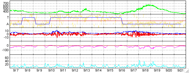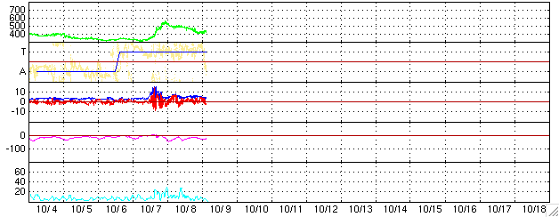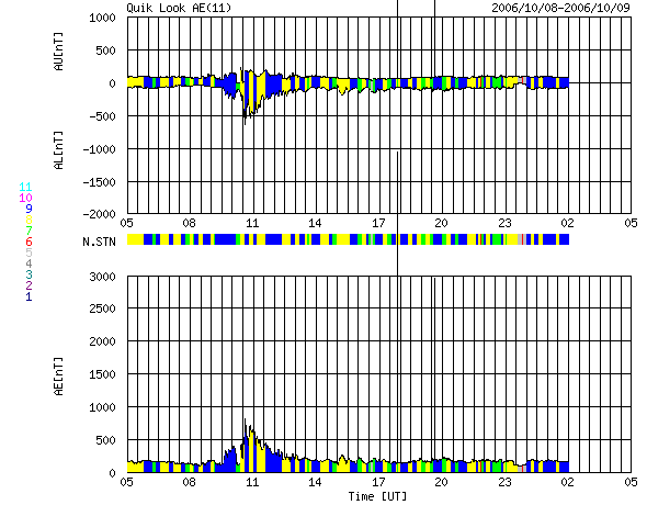ACEが観測した太陽風の磁場(1番上の枠、白線は全体の強度、赤線は南北成分) および、太陽風の密度(3番目の橙線)、速度(4番目の黄線) (c) NOAA/SEC ![]() リアルタイムAE指数 下段のAEグラフの値が高くなると、オーロラ活動が活発化しています。 (c) 京都大学, NICT ![]() シベリアで観測された3日間の磁場データ 右側の3分の1が、昨日のデータになります。グラフが上がったり下がったりすると、オーロラ活動が活発化しています。 (c) NICT ![]() GOES衛星の太陽X線データ (c) NOAA/SEC ![]() 27日の太陽周期に合わせたデータプロット (太陽風版) 太陽が同じ面を地球に向けていた27日前の変化から、今後を予想することができます。 (c) NICT