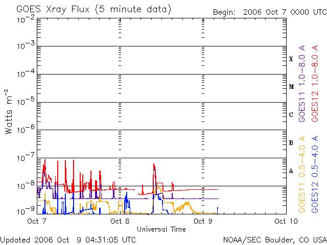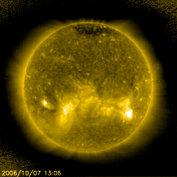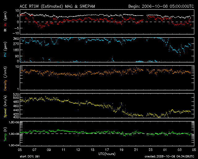 2006/10/ 9 13:35 更新 太陽風速度は440km/秒まで減速しました。磁気圏は静穏です。 担当 北村 太陽風の速度は、昨日以来減少を続け現在は440km/秒まで下がっています。 太陽風磁場の南北成分(赤い線)は2-3nTの弱い強度で概ね北を向いており、 太陽風のエネルギーが磁気圏に流入しにくい状態です。 AE指数とみると10時UT頃に弱いオーロラ嵐が確認できますが、それ以外は 非常に静穏な状態が続いています。 太陽表面の活動は非常に静穏で、GOESのX線のグラフをみると、大きなフレア等は 発生しておらず、平均的な強度のレベルも大変低い状態が続いています。 前周期の変動と比較すると、10日頃まで太陽風磁場の弱い変動が続く可能性が あります。オーロラの活動度が若干あがる可能性はありますが、 大きな磁気嵐に発達する可能性は低いと思われます。 SOHO衛星のEIT284カメラの映像 (c) SOHO (ESA & NASA)