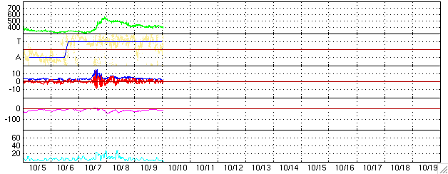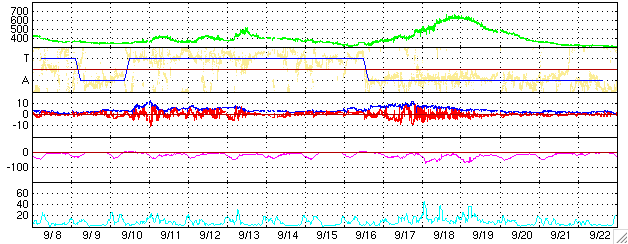 ACEが観測した太陽風の磁場(1番上の枠、白線は全体の強度、赤線は南北成分) および、太陽風の密度(3番目の橙線)、速度(4番目の黄線) (c) NOAA/SEC ![]() リアルタイムAE指数 下段のAEグラフの値が高くなると、オーロラ活動が活発化しています。 (c) 京都大学, NICT ![]() シベリアで観測された3日間の磁場データ 右側の3分の1が、昨日のデータになります。グラフが上がったり下がったりすると、オーロラ活動が活発化しています。 (c) NICT ![]() SOHO衛星のMDIカメラによる太陽黒点 (c) SOHO (ESA & NASA) ![]() GOES衛星の太陽X線データ (c) NOAA/SEC ![]() 27日の太陽周期に合わせたデータプロット (太陽風版) 太陽が同じ面を地球に向けていた27日前の変化から、今後を予想することができます。 (c) NICT