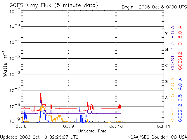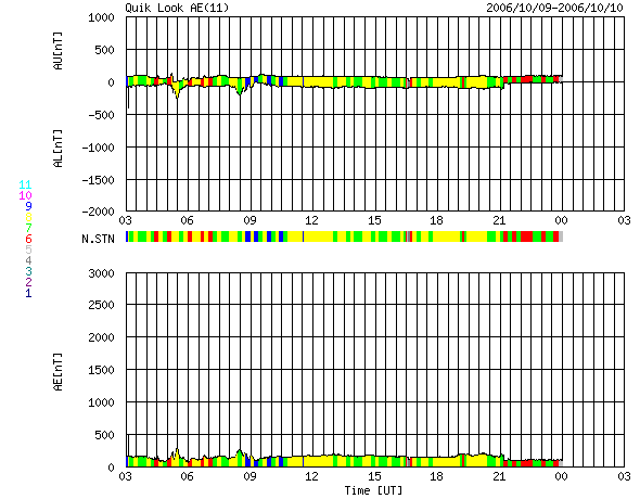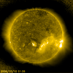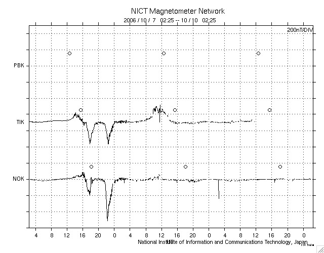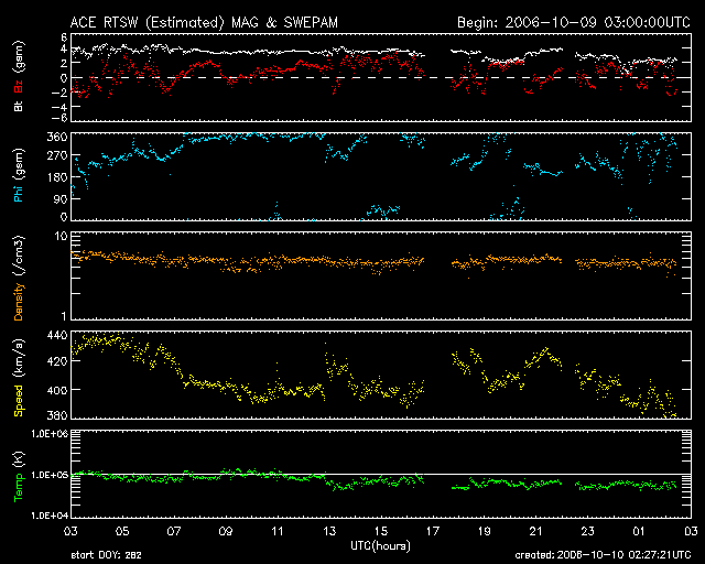 2006/10/10 11:29 更新 太陽風、磁気圏ともに静穏な状態が続いています。 担当 篠原 太陽風速度は緩やかに減少しながら、現在は400km/秒程度で推移しています。 太陽風磁場の南北成分(赤い線)は概ね北向(正の値)が続いており、太陽風の エネルギーが磁気圏に入りにくい状態です。 AE指数は、200nT程度の非常に静穏な状態が継続しており、オーロラの活動は みられません。シベリア磁場データも非常に静穏な状態を示しています。 SOHO EIT284の画像を見ると、明るい活動領域は西の端(向かって右側)へ 移動しています。GOESのX線のグラフを見る限りでは、もともと非常に 活動度の低い活動領域でしたので、今後さらにX線フレアー等の発生は 少なくなると思われます。 明るい活動領域のやや東側(向かって左側)のうっすら暗い部分が 前周期での高速太陽風の領域に相当する位置だと思われます。 この領域が、西側に回って来たときに地球近傍で高速太陽風が 観測されると思われます。 前周期と比較すると、13-14日くらいになりそうです。 SOHO衛星のEIT284カメラの映像 (c) SOHO (ESA & NASA)